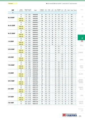 Oversized h stock standard, ) check stock EU, f check stock JP, m stock exhaustion UNF TCTR Ø Hole Ø(tolerance)(mm)(mm)CodeTHCHT(chamfer)LF(mm)THL(mm) LU(mm) LS DCON K(mm)(mm)(mm)LK(mm)NOFTypeStock Intro JIS P2 3.5 3.55 TNMQUN8I5 5P 60 13 21 33 5.5 4.5 7 4 001 f No.8-36UNF P2 3.5 3.55 TNMQUN8I1 1.5P 60 13 21 33 5.5 4.5 7 4 001 f SP P3(P2+20) 3.5 3.55 TNMRUN8I5 5P 60 13 21 33 5.5 4.5 7 4 001 f P3(P2+20) 3.5 3.55 TNMRUN8I1 1.5P 60 13 21 33 5.5 4.5 7 4 001 f P2 4.1 4.12 TNMQUNAJ5 5P 60 13 22 33 5.5 4.5 7 4 001 f P2 4.1 4.12 TNMQUNAJ1 1.5P 60 13 22 33 5.5 4.5 7 4 001 f SL No.10-32UNF P3(P2+20) 4.1 4.12 TNMRUNAJ5 5P 60 13 22 33 5.5 4.5 7 4 001 f P3(P2+20) 4.1 4.12 TNMRUNAJ1 1.5P 60 13 22 33 5.5 4.5 7 4 001 f P2 4.6 4.67 TNMQUNCK5 5P 62 15 26 33 6 4.5 7 4 001 f PO P2 4.6 4.67 TNMQUNCK1 1.5P 62 15 26 33 6 4.5 7 4 001 f No.12-28UNF P3(P2+20) 4.6 4.67 TNMRUNCK5 5P 62 15 26 33 6 4.5 7 4 001 f P3(P2+20) 4.6 4.67 TNMRUNCK1 1.5P 62 15 26 33 6 4.5 7 4 001 f P2 5.5 5.53 TNMQU04K5 5P 62 15 26 33 6 4.5 7 4 001 f ST 1/4-28UNF P2 5.5 5.53 TNMQU04K1 1.5P 62 15 26 33 6 4.5 7 4 001 f JIS P4(P2+40) 5.5 5.53 TNMSU04K5 5P 62 15 26 33 6 4.5 7 4 001 f P4(P2+40) 5.5 5.53 TNMSU04K1 1.5P 62 15 26 33 6 4.5 7 4 001 f P2 6.9 6.97 TNMQU05M5 5P 70 19 - 36 6.2 5 8 4 002 f ROLL P2 6.9 6.97 TNMQU05M1 1.5P 70 19 - 36 6.2 5 8 4 002 f 5/16-24UNF P4(P2+40) 6.9 6.97 TNMSU05M5 5P 70 19 - 36 6.2 5 8 4 002 f P4(P2+40) 6.9 6.97 TNMSU05M1 1.5P 70 19 - 36 6.2 5 8 4 002 f CARBIDE P3 8.5 8.57 TNMRU06M5 5P 75 23 - 38 7 5.5 8 4 002 f P3 8.5 8.57 TNMRU06M1 1.5P 75 23 - 38 7 5.5 8 4 002 f 3/8-24UNF P4(P3+20) 8.5 8.57 TNMSU06M5 5P 75 23 - 38 7 5.5 8 4 002 f P4(P3+20) 8.5 8.57 TNMSU06M1 1.5P 75 23 - 38 7 5.5 8 4 002 f LONG P3 9.9 9.96 TNMRU07N5 5P 82 26 - 42 8.5 6.5 9 4 002 f P3 9.9 9.96 TNMRU07N1 1.5P 82 26 - 42 8.5 6.5 9 4 002 f 7/16-20UNF P4(P3+20) 9.9 9.96 TNMSU07N5 5P 82 26 - 42 8.5 6.5 9 4 002 f HAND P4(P3+20) 9.9 9.96 TNMSU07N1 1.5P 82 26 - 42 8.5 6.5 9 4 002 f TAPS P3 11.5 11.54 TNMRU08N5 5P 88 26 - 45 10.5 8 11 4 002 f P3 11.5 11.54 TNMRU08N1 1.5P 88 26 - 45 10.5 8 11 4 002 f 1/2-20UNF P4(P3+20) 11.5 11.54 TNMSU08N5 5P 88 26 - 45 10.5 8 11 4 002 f EG (STI) P4(P3+20) 11.5 11.54 TNMSU08N1 1.5P 88 26 - 45 10.5 8 11 4 002 f P3 12.9 13 TNMRU09O5 5P 95 26 - 48 12.5 10 13 4 002 f P3 12.9 13 TNMRU09O1 1.5P 95 26 - 48 12.5 10 13 4 002 f SPECIAL 9/16-18UNF P4(P3+20) 12.9 13 TNMSU09O5 5P 95 26 - 48 12.5 10 13 4 002 f THREADS,GAUGES P4(P3+20) 12.9 13 TNMSU09O1 1.5P 95 26 - 48 12.5 10 13 4 002 f P3 14.5 14.6 TNMRU10O5 5P 95 26 - 48 12.5 10 13 4 002 f P3 14.5 14.6 TNMRU10O1 1.5P 95 26 - 48 12.5 10 13 4 002 f THREAD 5/8-18UNF P4(P3+20) 14.5 14.6 TNMSU10O5 5P 95 26 - 48 12.5 10 13 4 002 f MILLS P4(P3+20) 14.5 14.6 TNMSU10O1 1.5P 95 26 - 48 12.5 10 13 4 002 f P3 17.5 17.59 TNMRU12P5 5P 105 33 - 50 15 12 15 4 002 f P3 17.5 17.59 TNMRU12P1 1.5P 105 33 - 50 15 12 15 4 002 f DIES 3/4-16UNF P4(P3+20) 17.5 17.59 TNMSU12P5 5P 105 33 - 50 15 12 15 4 002 f P4(P3+20) 17.5 17.59 TNMSU12P1 1.5P 105 33 - 50 15 12 15 4 002 f 7/8-14UNF P4 20.5 20.57 TNMSU14Q5 5P 115 33 - 55 17 13 16 4 002 f CENTERP420.520.57TNMSU14Q11.5P11533-551713164002fDRILLS Technical info 315