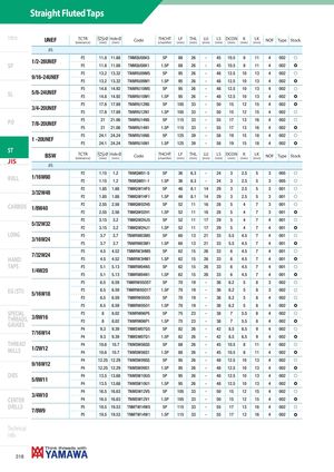 Straight Fluted Taps Intro UNEF TCTR Ø Hole Ø(tolerance)(mm)(mm)CodeTHCHT(chamfer)LF(mm)THL(mm) LU(mm) LS DCON K(mm)(mm)(mm)LK(mm)NOFTypeStock JIS P2 11.8 11.88 TNMQU08K5 5P 88 26 - 45 10.5 8 11 4 002 f 1/2-28UNEF SP P2 11.8 11.88 TNMQU08K1 1.5P 88 26 - 45 10.5 8 11 4 002 ) P3 13.2 13.32 TNMRU09M5 5P 95 26 - 48 12.5 10 13 4 002 f 9/16-24UNEF P3 13.2 13.32 TNMRU09M1 1.5P 95 26 - 48 12.5 10 13 4 002 ) P3 14.8 14.92 TNMRU10M5 5P 95 26 - 48 12.5 10 13 4 002 f SL 5/8-24UNEF P3 14.8 14.92 TNMRU10M1 1.5P 95 26 - 48 12.5 10 13 4 002 ) P3 17.8 17.89 TNMRU12N5 5P 105 33 - 50 15 12 15 4 002 ) 3/4-20UNEF P3 17.8 17.89 TNMRU12N1 1.5P 105 33 - 50 15 12 15 4 002 f PO 7/8-20UNEF P3 21 21.06 TNMRU14N5 5P 115 33 - 55 17 13 16 4 002 f P3 21 21.06 TNMRU14N1 1.5P 115 33 - 55 17 13 16 4 002 ) P3 24.1 24.24 TNMRU16N5 5P 125 39 - 58 19 15 18 4 002 f 1 -20UNEF P3 24.1 24.24 TNMRU16N1 1.5P 125 39 - 58 19 15 18 4 002 ) ST JIS BSW TCTR Ø Hole Ø(tolerance)(mm)(mm)CodeTHCHT(chamfer)LF(mm)THL(mm) LU(mm) LS DCON K(mm)(mm)(mm)LK(mm)NOFTypeStock JIS P2 1.15 1.2 TNMQW01-5 5P 36 6.3 - 24 3 2.5 5 3 005 f ROLL 1/16W60 P2 1.15 1.2 TNMQW01-1 1.5P 36 6.3 - 24 3 2.5 5 3 005 f P2 1.85 1.88 TNMQW1HF5 5P 46 8.1 14 29 3 2.5 5 3 001 f 3/32W48 P2 1.85 1.88 TNMQW1HF1 1.5P 46 8.1 14 29 3 2.5 5 3 001 f CARBIDE 1/8W40 P2 2.55 2.56 TNMQW02H5 5P 52 11 16 28 5 4 7 3 001 f P2 2.55 2.56 TNMQW02H1 1.5P 52 11 16 28 5 4 7 3 001 ) P2 3.15 3.2 TNMQW2HJ5 5P 52 11 17 29 5 4 7 4 001 f 5/32W32 P2 3.15 3.2 TNMQW2HJ1 1.5P 52 11 17 29 5 4 7 4 001 ) LONG P3 3.7 3.7 TNMRW03M5 5P 60 13 21 33 5.5 4.5 7 4 001 f 3/16W24 P3 3.7 3.7 TNMRW03M1 1.5P 60 13 21 33 5.5 4.5 7 4 001 ) P3 4.5 4.52 TNMRW3HM5 5P 62 15 26 33 6 4.5 7 4 001 f 7/32W24 HAND P3 4.5 4.52 TNMRW3HM1 1.5P 62 15 26 33 6 4.5 7 4 001 ) TAPS P3 5.1 5.13 TNMRW04N5 5P 62 15 26 33 6 4.5 7 4 001 f 1/4W20 P3 5.1 5.13 TNMRW04N1 1.5P 62 15 26 33 6 4.5 7 4 001 ) P3 6.5 6.59 TNMRW05O5T 5P 70 19 - 36 6.2 5 8 3 002 f EG (STI) 5/16W18 P3 6.5 6.59 TNMRW05O1T 1.5P 70 19 - 36 6.2 5 8 3 002 f P3 6.5 6.59 TNMRW05O5 5P 70 19 - 36 6.2 5 8 4 002 f P3 6.5 6.59 TNMRW05O1 1.5P 70 19 - 36 6.2 5 8 4 002 ) SPECIALTHREADS,3/8W16GAUGES P3 8 8.02 TNMRW06P5 5P 75 23 - 38 7 5.5 8 4 002 fP388.02TNMRW06P11.5P7523-3875.584002) P4 9.3 9.39 TNMSW07Q5 5P 82 26 - 42 8.5 6.5 9 4 002 f 7/16W14 P4 9.3 9.39 TNMSW07Q1 1.5P 82 26 - 42 8.5 6.5 9 4 002 ) THREAD P4 10.6 10.7 TNMSW08S5 5P 88 26 - 45 10.5 8 11 4 002 f MILLS 1/2W12 P4 10.6 10.7 TNMSW08S1 1.5P 88 26 - 45 10.5 8 11 4 002 ) P4 12.25 12.29 TNMSW09S5 5P 95 26 - 48 12.5 10 13 4 002 f 9/16W12 P4 12.25 12.29 TNMSW09S1 1.5P 95 26 - 48 12.5 10 13 4 002 ) DIES 5/8W11 P4 13.5 13.68 TNMSW10U5 5P 95 26 - 48 12.5 10 13 4 002 f P4 13.5 13.68 TNMSW10U1 1.5P 95 26 - 48 12.5 10 13 4 002 ) P4 16.5 16.63 TNMSW12V5 5P 105 33 - 50 15 12 15 4 002 f 3/4W10 CENTER P4 16.5 16.63 TNMSW12V1 1.5P 105 33 - 50 15 12 15 4 002 ) DRILLS 7/8W9 P5 19.5 19.53 TNMTW14W5 5P 115 33 - 55 17 13 16 4 002 f P5 19.5 19.53 TNMTW14W1 1.5P 115 33 - 55 17 13 16 4 002 ) Technical info 318