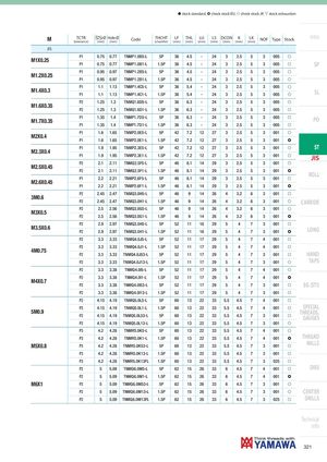h stock standard, ) check stock EU, f check stock JP, m stock exhaustion M TCTR Ø Hole Ø(tolerance)(mm)(mm)CodeTHCHT(chamfer)LF(mm)THL(mm) LU(mm) LS DCON K(mm)(mm)(mm)LK(mm)NOFTypeStock Intro JIS P1 0.75 0.77 TNMP1.0B5-L 5P 36 4.5 - 24 3 2.5 5 3 005 f M1X0.25 P1 0.75 0.77 TNMP1.0B1-L 1.5P 36 4.5 - 24 3 2.5 5 3 005 f SP P1 0.95 0.97 TNMP1.2B5-L 5P 36 4.5 - 24 3 2.5 5 3 005 f M1.2X0.25 P1 0.95 0.97 TNMP1.2B1-L 1.5P 36 4.5 - 24 3 2.5 5 3 005 f P1 1.1 1.13 TNMP1.4C5-L 5P 36 5.4 - 24 3 2.5 5 3 005 f M1.4X0.3 P1 1.1 1.13 TNMP1.4C1-L 1.5P 36 5.4 - 24 3 2.5 5 3 005 f SL P2 1.25 1.3 TNMQ1.6D5-L 5P 36 6.3 - 24 3 2.5 5 3 005 f M1.6X0.35 P2 1.25 1.3 TNMQ1.6D1-L 1.5P 36 6.3 - 24 3 2.5 5 3 005 f M1.7X0.35 P1 1.35 1.4 TNMP1.7D5-L 5P 36 6.3 - 24 3 2.5 5 3 005 f PO P1 1.35 1.4 TNMP1.7D1-L 1.5P 36 6.3 - 24 3 2.5 5 3 005 f P1 1.6 1.65 TNMP2.0E5-L 5P 42 7.2 12 27 3 2.5 5 3 001 f M2X0.4 P1 1.6 1.65 TNMP2.0E1-L 1.5P 42 7.2 12 27 3 2.5 5 3 001 ) P1 1.9 1.95 TNMP2.3E5-L 5P 42 7.2 12 27 3 2.5 5 3 001 f ST M2.3X0.4 P1 1.9 1.95 TNMP2.3E1-L 1.5P 42 7.2 12 27 3 2.5 5 3 001 f JIS P2 2.1 2.11 TNMQ2.5F5-L 5P 46 8.1 14 29 3 2.5 5 3 001 f M2.5X0.45 P2 2.1 2.11 TNMQ2.5F1-L 1.5P 46 8.1 14 29 3 2.5 5 3 001 ) P1 2.2 2.21 TNMP2.6F5-L 5P 46 8.1 14 29 3 2.5 5 3 001 f ROLL M2.6X0.45 P1 2.2 2.21 TNMP2.6F1-L 1.5P 46 8.1 14 29 3 2.5 5 3 001 ) P2 2.45 2.47 TNMQ3.0H5-L 5P 46 9 14 26 4 3.2 6 3 001 f 3M0.6 P2 2.45 2.47 TNMQ3.0H1-L 1.5P 46 9 14 26 4 3.2 6 3 001 f CARBIDE P2 2.5 2.56 TNMQ3.0G5-L 5P 46 9 14 26 4 3.2 6 3 001 f M3X0.5 P2 2.5 2.56 TNMQ3.0G1-L 1.5P 46 9 14 26 4 3.2 6 3 001 ) P2 2.9 2.97 TNMQ3.5H5-L 5P 52 11 16 29 5 4 7 3 001 f M3.5X0.6 P2 2.9 2.97 TNMQ3.5H1-L 1.5P 52 11 16 29 5 4 7 3 001 ) LONG P2 3.3 3.33 TNMQ4.0J5-L 5P 52 11 17 29 5 4 7 4 001 f P2 3.3 3.33 TNMQ4.0J1-L 1.5P 52 11 17 29 5 4 7 4 001 f 4M0.75 P2 3.3 3.33 TNMQ4.0J53-L 5P 52 11 17 29 5 4 7 3 001 f HAND P2 3.3 3.33 TNMQ4.0J13-L 1.5P 52 11 17 29 5 4 7 3 001 f TAPS P2 3.3 3.38 TNMQ4.0I5-L 5P 52 11 17 29 5 4 7 4 001 f P2 3.3 3.38 TNMQ4.0I1-L 1.5P 52 11 17 29 5 4 7 4 001 ) M4X0.7 P2 3.3 3.38 TNMQ4.0I53-L 5P 52 11 17 29 5 4 7 3 001 f EG (STI) P2 3.3 3.38 TNMQ4.0I13-L 1.5P 52 11 17 29 5 4 7 3 001 f P2 4.15 4.19 TNMQ5.0L5-L 5P 60 13 22 33 5.5 4.5 7 4 001 f P2 4.15 4.19 TNMQ5.0L1-L 1.5P 60 13 22 33 5.5 4.5 7 4 001 f SPECIAL 5M0.9 P2 4.15 4.19 TNMQ5.0L53-L 5P 60 13 22 33 5.5 4.5 7 3 001 f THREADS,GAUGES P2 4.15 4.19 TNMQ5.0L13-L 1.5P 60 13 22 33 5.5 4.5 7 3 001 f P3 4.2 4.28 TNMR5.0K5-L 5P 60 13 22 33 5.5 4.5 7 4 001 f P3 4.2 4.28 TNMR5.0K1-L 1.5P 60 13 22 33 5.5 4.5 7 4 001 ) THREAD M5X0.8 P3 4.2 4.28 TNMR5.0K53-L 5P 60 13 22 33 5.5 4.5 7 3 001 f MILLS P3 4.2 4.28 TNMR5.0K13-L 1.5P 60 13 22 33 5.5 4.5 7 3 001 f P3 4.2 4.28 TNMR5.0K13FL 1.5P 60 13 22 33 5.5 4.5 7 3 025 f P2 5 5.09 TNMQ6.0M5-L 5P 62 15 26 33 6 4.5 7 4 001 f DIES P2 5 5.09 TNMQ6.0M1-L 1.5P 62 15 26 33 6 4.5 7 4 001 ) M6X1 P2 5 5.09 TNMQ6.0M53-L 5P 62 15 26 33 6 4.5 7 3 001 f P2 5 5.09 TNMQ6.0M13-L 1.5P 62 15 26 33 6 4.5 7 3 001 f CENTER P2 5 5.09 TNMQ6.0M13FL 1.5P 62 15 26 33 6 4.5 7 3 025 f DRILLS Technical info 321
