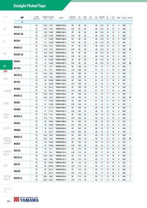 Straight Fluted Taps Intro MF TCTR Ø Hole Ø(tolerance)(mm)(mm)CodeTHCHT(chamfer)LF(mm)THL(mm) LU(mm) LS DCON K(mm)(mm)(mm)LK(mm)NOFTypeStock JIS P3 13.5 13.6 TNMR015O5-L 5P 95 26 - 48 12.5 10 13 4 002 f M15X1.5 SP P3 13.5 13.6 TNMR015O1-L 1.5P 95 26 - 48 12.5 10 13 4 002 f P4 13.8 13.85 TNMS015N5-L 5P 95 26 - 48 12.5 10 13 4 002 f M15X1.25 P4 13.8 13.85 TNMS015N1-L 1.5P 95 26 - 48 12.5 10 13 4 002 f P3 14 14.09 TNMR015M5-L 5P 95 26 - 48 12.5 10 13 4 002 f SL M15X1 P3 14 14.09 TNMR015M1-L 1.5P 95 26 - 48 12.5 10 13 4 002 f P3 14.5 14.6 TNMR016O5-L 5P 95 26 - 48 12.5 10 13 4 002 f M16X1.5 P3 14.5 14.6 TNMR016O1-L 1.5P 95 26 - 48 12.5 10 13 4 002 ) PO M16X1.25 P4 14.8 14.85 TNMS016N5-L 5P 95 26 - 48 12.5 10 13 4 002 f P4 14.8 14.85 TNMS016N1-L 1.5P 95 26 - 48 12.5 10 13 4 002 f P3 15 15.09 TNMR016M5-L 5P 95 26 - 48 12.5 10 13 4 002 f M16X1 P3 15 15.09 TNMR016M1-L 1.5P 95 26 - 48 12.5 10 13 4 002 ) ST P3 15 15.1 TNMR017Q5-L 5P 100 33 - 51 14 11 14 4 002 f M17X2 JIS P3 15 15.1 TNMR017Q1-L 1.5P 100 33 - 51 14 11 14 4 002 f P4 15.5 15.6 TNMS017O5-L 5P 100 33 - 51 14 11 14 4 002 f M17X1.5 P4 15.5 15.6 TNMS017O1-L 1.5P 100 33 - 51 14 11 14 4 002 f ROLL P3 16 16.09 TNMR017M5-L 5P 100 18 - 51 14 11 14 4 037 f M17X1 P3 16 16.09 TNMR017M1-L 1.5P 100 18 - 51 14 11 14 4 037 f P4 16 16.12 TNMS018Q5-L 5P 100 33 - 51 14 11 14 4 002 f M18X2 CARBIDE P4 16 16.12 TNMS018Q1-L 1.5P 100 33 - 51 14 11 14 4 002 f P3 16.5 16.6 TNMR018O5-L 5P 100 33 - 51 14 11 14 4 002 f M18X1.5 P3 16.5 16.6 TNMR018O1-L 1.5P 100 33 - 51 14 11 14 4 002 ) P3 17 17.09 TNMR018M5-L 5P 100 18 - 51 14 11 14 4 037 f LONG M18X1 P3 17 17.09 TNMR018M1-L 1.5P 100 18 - 51 14 11 14 4 037 f P4 17 17.12 TNMS019Q5-L 5P 105 33 - 50 15 12 15 4 002 f M19X2 P4 17 17.12 TNMS019Q1-L 1.5P 105 33 - 50 15 12 15 4 002 f HAND P3 17.5 17.6 TNMR019O5-L 5P 105 33 - 50 15 12 15 4 002 f TAPS M19X1.5 P3 17.5 17.6 TNMR019O1-L 1.5P 105 33 - 50 15 12 15 4 002 f P3 18 18.09 TNMR019M5-L 5P 105 18 - 50 15 12 15 4 037 f M19X1 P3 18 18.09 TNMR019M1-L 1.5P 105 18 - 50 15 12 15 4 037 f EG (STI) P4 18 18.12 TNMS020Q5-L 5P 105 33 - 50 15 12 15 4 002 f M20X2 P4 18 18.12 TNMS020Q1-L 1.5P 105 33 - 50 15 12 15 4 002 f P3 18.5 18.6 TNMR020O5-L 5P 105 33 - 50 15 12 15 4 002 f SPECIAL M20X1.5 P3 18.5 18.6 TNMR020O1-L 1.5P 105 33 - 50 15 12 15 4 002 ) THREADS,GAUGESM20X1 P3 19 19.09 TNMR020M5-L 5P 105 18 - 50 15 12 15 4 037 f P3 19 19.09 TNMR020M1-L 1.5P 105 18 - 50 15 12 15 4 037 f P4 19 19.1 TNMS021Q5-L 5P 115 33 - 55 17 13 16 4 002 f THREAD M21X2 P4 19 19.1 TNMS021Q1-L 1.5P 115 33 - 55 17 13 16 4 002 f MILLS P3 19.5 19.6 TNMR021O5-L 5P 115 33 - 55 17 13 16 4 002 f M21X1.5 P3 19.5 19.6 TNMR021O1-L 1.5P 115 33 - 55 17 13 16 4 002 f P3 20 20.09 TNMR021M5-L 5P 115 19 - 55 17 13 16 4 037 f DIES M21X1 P3 20 20.09 TNMR021M1-L 1.5P 115 19 - 55 17 13 16 4 037 f P4 20 20.12 TNMS022Q5-L 5P 115 33 - 55 17 13 16 4 002 f M22X2 P4 20 20.12 TNMS022Q1-L 1.5P 115 33 - 55 17 13 16 4 002 f CENTERDRILLSM22X1.5 P3 20.5 20.6 TNMR022O5-L 5P 115 33 - 55 17 13 16 4 002 fP320.520.6TNMR022O1-L1.5P11533-551713164002f Technical info 324