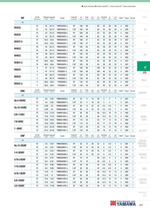h stock standard, ) check stock EU, f check stock JP, m stock exhaustion MF TCTR Ø Hole Ø(tolerance)(mm)(mm)CodeTHCHT(chamfer)LF(mm)THL(mm) LU(mm) LS DCON K(mm)(mm)(mm)LK(mm)NOFTypeStock Intro JIS P5 42 42.13 TNMT045S5-L 5P 180 59 - 83 35 26 30 4 002 f M45X3 P5 42 42.13 TNMT045S1-L 1.5P 180 59 - 83 35 26 30 4 002 f SP P4 43 43.12 TNMS045Q5-L 5P 180 59 - 83 35 26 30 4 002 f M45X2 P4 43 43.12 TNMS045Q1-L 1.5P 180 59 - 83 35 26 30 4 002 f P4 43.5 43.6 TNMS045O5-L 5P 180 27 - 83 35 26 30 4 037 f M45X1.5 P4 43.5 43.6 TNMS045O1-L 1.5P 180 27 - 83 35 26 30 4 037 f SL P6 45 45.13 TNMU048S5-L 5P 185 65 - 85 38 29 32 4 002 f M48X3 P6 45 45.13 TNMU048S1-L 1.5P 185 65 - 85 38 29 32 4 002 f M48X2 P4 46 46.12 TNMS048Q5-L 5P 185 65 - 85 38 29 32 4 002 f PO P4 46 46.12 TNMS048Q1-L 1.5P 185 65 - 85 38 29 32 4 002 f P4 46.5 46.6 TNMS048O5-L 5P 185 28 - 85 38 29 32 4 037 f M48X1.5 P4 46.5 46.6 TNMS048O1-L 1.5P 185 28 - 85 38 29 32 4 037 f II 47 47.13 TH2050S5-L 5P 180 80 - 100 40 32 35 4 002 f ST M50X3 II 47 47.13 TH2050S1-L 1.5P 180 80 - 100 40 32 35 4 002 f JIS II 48 48.12 TH2050Q5-L 5P 130 45 - 85 40 32 35 4 002 f M50X2 II 48 48.12 TH2050Q1-L 1.5P 130 45 - 85 40 32 35 4 002 f II 48.5 48.6 TH2050O5-L 5P 130 45 - 85 40 32 35 4 002 f ROLL M50X1.5 II 48.5 48.6 TH2050O1-L 1.5P 130 45 - 85 40 32 35 4 002 f UNC TCTR Ø Hole Ø(tolerance)(mm)(mm)CodeTHCHT(chamfer)LF(mm)THL(mm) LU(mm) LS DCON K(mm)(mm)(mm)LK(mm)NOFTypeStock CARBIDE JIS P2 2.6 2.64 TNMQUN5H5-L 5P 52 11 16 28 5 4 7 3 001 f No.5-40UNC P2 2.6 2.64 TNMQUN5H1-L 1.5P 52 11 16 28 5 4 7 3 001 f P2 3.89 3.9 TNMQUNAM5-L 5P 60 13 22 32 5.5 4.5 7 4 001 f LONG No.10-24UNC P2 3.89 3.9 TNMQUNAM1-L 1.5P 60 13 22 32 5.5 4.5 7 4 001 f P4 13.6 13.75 TNMSU10U5-L 5P 95 26 - 48 12.5 10 13 4 002 f 5/8-11UNC P4 13.6 13.75 TNMSU10U1-L 1.5P 95 26 - 48 12.5 10 13 4 002 f HAND P4 19.6 19.61 TNMSU14W5-L 5P 115 33 - 55 17 13 16 4 002 f TAPS 7/8-9UNC P4 19.6 19.61 TNMSU14W1-L 1.5P 115 33 - 55 17 13 16 4 002 f P4 22.3 22.45 TNMSU16X5-L 5P 125 39 - 58 19 15 18 4 002 f 1 -8UNC P4 22.3 22.45 TNMSU16X1-L 1.5P 125 39 - 58 19 15 18 4 002 f EG (STI) UNF TCTR Ø Hole Ø(tolerance)(mm)(mm)CodeTHCHT(chamfer)LF(mm)THL(mm) LU(mm) LS DCON K(mm)(mm)(mm)LK(mm)NOFTypeStock JIS SPECIAL P2 4.6 4.67 TNMQUNCK5-L 5P 62 15 26 32 6 4.5 7 4 001 f THREADS, No.12-28UNF P2 4.6 4.67 TNMQUNCK1-L 1.5P 62 15 26 32 6 4.5 7 4 001 f GAUGES P2 5.5 5.53 TNMQU04K1-L 5P 62 15 26 33 6 4.5 7 4 001 f 1/4-28UNF P2 5.5 5.53 TNMQU04K5-L 1.5P 62 15 26 33 6 4.5 7 4 001 f THREAD P2 6.9 6.97 TNMQU05M5-L 5P 70 19 - 36 6.2 5 8 4 002 f MILLS 5/16-24UNF P2 6.9 6.97 TNMQU05M1-L 1.5P 70 19 - 36 6.2 5 8 4 002 f P3 9.9 9.96 TNMRU07N5-L 5P 82 26 - 42 8.5 6.5 9 4 002 f 7/16-20UNF P3 9.9 9.96 TNMRU07N1-L 1.5P 82 26 - 42 8.5 6.5 9 4 002 f DIES P3 12.9 13 TNMRU09O5-L 5P 95 26 - 48 12.5 10 13 4 002 f 9/16-18UNF P3 12.9 13 TNMRU09O1-L 1.5P 95 26 - 48 12.5 10 13 4 002 f 5/8-18UNF P3 14.5 14.6 TNMRU10O5-L 5P 95 26 - 48 12.5 10 13 4 002 f CENTER P3 14.5 14.6 TNMRU10O1-L 1.5P 95 26 - 48 12.5 10 13 4 002 f DRILLS 3/4-16UNF P3 17.5 17.59 TNMRU12P5-L 5P 105 33 - 50 15 12 15 4 002 f Technical info 327