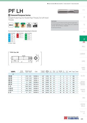 h stock standard, ) check stock EU, f check stock JP, m stock exhaustion PF LH Intro GP General Purpose Series Straight Fluted Taps for Parallel Pipe Threads, for Left Hand SP Threads FEATURES LH 3.5PHSS-ELEFT HANDTHCHT General purpose for blind and through hole application.For steel application at low cutting speed, also suitable for SLcast iron and non-ferrous materials.For left hand threads. Recommended Tapping Speeds Depending On Materials PO ISO Vc (m/min) ISO Vc (m/min) ISO Vc (m/min) P1 5÷10 I K1 5÷10 I N2 5÷10 I P2 5÷10 H K2 5÷10 I N3 5÷10 I P3 5÷10 I N4 5÷10 I ST P4 5÷10 I JIS H 1st choice I suitable ROLL JIS-PF LH TYPE: Pipe_046 CARBIDE DCON K THL LK KLF LONG HAND TAPS G(BSP) TCTR Ø Hole Ø(tolerance)(mm)(mm)CodeTHCHT(chamfer)Basicmajor Ø(mm)LF(mm)THL(mm)LSDCON K(mm)(mm)(mm)LK(mm)NOFType Stock JIS 1/8-28 II 8.75 8.78 TH2F02K--L 3.5P 9.728 55 19 - 8 6 9 4 046 f EG (STI) 1/4-19 II 11.75 11.78 TH2F04---L 3.5P 13.157 62 28 - 11 9 12 4 046 f 3/8-19 II 15.25 15.28 TH2F06---L 3.5P 16.662 65 28 - 14 11 14 4 046 f 1/2-14 II 19 19.04 TH2F08Q--L 3.5P 20.955 80 35 - 18 14 17 4 046 f SPECIALTHREADS, 3/4-14 II 24.5 24.52 TH2F12Q--L 3.5P 26.441 85 35 - 23 17 20 4 046 f GAUGES 1 -11 II 30.75 30.77 TH2F16U--L 3.5P 33.249 95 45 - 26 21 24 4 046 f 1 1/4-11 II 39.3 39.43 TH2F20U--L 3.5P 41.910 105 45 - 32 26 30 4 046 f 1 1/2-112 -11 II 45.25 45.33 TH2F24U--L 3.5P 47.803 110 45 - 38 29 32 6 046 f THREADMILLSII5757.1TH2F32U--L3.5P59.61412050-4635386046f DIES CENTER DRILLS Technical info 329