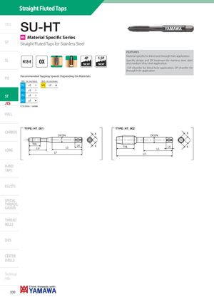 Straight Fluted Taps Intro SU-HT MS Material Specific Series SP Straight Fluted Taps for Stainless Steel FEATURES SL HSS-E OX 4P 1.5P Material specific for blind and through hole application.Specific design and OX treatment for stainless steel, steelTHCHTTHCHTand medium alloy steel application. 1.5P chamfer for blind hole application, 5P chamfer for through hole application. PO Recommended Tapping Speeds Depending On Materials ISO Vc (m/min) ISO Vc (m/min) P2 ≤5 I M1 ≤5 H P3 ≤5 I ST P4 ≤5 I P7 ≤5 H JIS H 1st choice I suitable ROLL JIS-SU-HT TYPE: HT_001 TYPE: HT_002 CARBIDE DCON K KDCON THLLONGLU LKLS K THL LK KLS LF LF HAND TAPS EG (STI) SPECIAL THREADS, GAUGES THREAD MILLS DIES CENTER DRILLS Technical info 330
