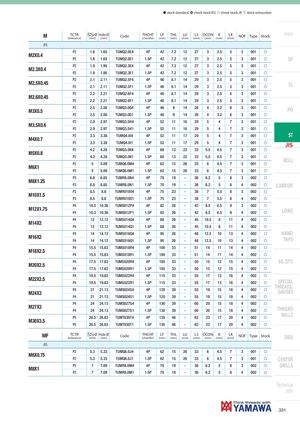 h stock standard, ) check stock EU, f check stock JP, m stock exhaustion M TCTR Ø Hole Ø(tolerance)(mm)(mm)CodeTHCHT(chamfer)LF(mm)THL(mm) LU(mm) LS DCON K(mm)(mm)(mm)LK(mm)NOFTypeStock Intro JIS P2 1.6 1.65 TUMQ2.0E4 4P 42 7.2 12 27 3 2.5 5 3 001 f M2X0.4 P2 1.6 1.65 TUMQ2.0E1 1.5P 42 7.2 12 27 3 2.5 5 3 001 f SP P2 1.9 1.95 TUMQ2.3E4 4P 42 7.2 12 27 3 2.5 5 3 001 f M2.3X0.4 P2 1.9 1.95 TUMQ2.3E1 1.5P 42 7.2 12 27 3 2.5 5 3 001 f P2 2.1 2.11 TUMQ2.5F4 4P 46 8.1 14 29 3 2.5 5 3 001 f M2.5X0.45 P2 2.1 2.11 TUMQ2.5F1 1.5P 46 8.1 14 29 3 2.5 5 3 001 f SL P2 2.2 2.21 TUMQ2.6F4 4P 46 8.1 14 29 3 2.5 5 3 001 f M2.6X0.45 P2 2.2 2.21 TUMQ2.6F1 1.5P 46 8.1 14 29 3 2.5 5 3 001 f M3X0.5 P2 2.5 2.56 TUMQ3.0G4 4P 46 9 14 26 4 3.2 6 3 001 f PO P2 2.5 2.56 TUMQ3.0G1 1.5P 46 9 14 26 4 3.2 6 3 001 f P2 2.9 2.97 TUMQ3.5H4 4P 52 11 16 29 5 4 7 3 001 f M3.5X0.6 P2 2.9 2.97 TUMQ3.5H1 1.5P 52 11 16 29 5 4 7 3 001 f P2 3.3 3.38 TUMQ4.0I4 4P 52 11 17 29 5 4 7 3 001 f ST M4X0.7 P2 3.3 3.38 TUMQ4.0I1 1.5P 52 11 17 29 5 4 7 3 001 f JIS P2 4.2 4.28 TUMQ5.0K4 4P 60 13 22 33 5.5 4.5 7 3 001 f M5X0.8 P2 4.2 4.28 TUMQ5.0K1 1.5P 60 13 22 33 5.5 4.5 7 3 001 f P2 5 5.09 TUMQ6.0M4 4P 62 15 26 33 6 4.5 7 3 001 f ROLL M6X1 P2 5 5.09 TUMQ6.0M1 1.5P 62 15 26 33 6 4.5 7 3 001 f P3 6.8 6.85 TUMR8.0N4 4P 70 19 - 36 6.2 5 8 3 002 f M8X1.25 P3 6.8 6.85 TUMR8.0N1 1.5P 70 19 - 36 6.2 5 8 4 002 f CARBIDE P3 8.5 8.6 TUMR010O4 4P 75 23 - 38 7 5.5 8 3 002 f M10X1.5 P3 8.5 8.6 TUMR010O1 1.5P 75 23 - 38 7 5.5 8 4 002 f P4 10.3 10.36 TUMS012P4 4P 82 26 - 42 8.5 6.5 9 3 002 f M12X1.75 P4 10.3 10.36 TUMS012P1 1.5P 82 26 - 42 8.5 6.5 9 4 002 f LONG P4 12 12.12 TUMS014Q4 4P 88 26 - 45 10.5 8 11 4 002 f M14X2 P4 12 12.12 TUMS014Q1 1.5P 88 26 - 45 10.5 8 11 4 002 f P4 14 14.12 TUMS016Q4 4P 95 26 - 48 12.5 10 13 4 002 f HAND M16X2 P4 14 14.12 TUMS016Q1 1.5P 95 26 - 48 12.5 10 13 4 002 f TAPS P4 15.5 15.63 TUMS018R4 4P 100 33 - 51 14 11 14 4 002 f M18X2.5 P4 15.5 15.63 TUMS018R1 1.5P 100 33 - 51 14 11 14 4 002 f P4 17.5 17.63 TUMS020R4 4P 105 33 - 50 15 12 15 4 002 f EG (STI) M20X2.5 P4 17.5 17.63 TUMS020R1 1.5P 105 33 - 50 15 12 15 4 002 f P4 19.5 19.63 TUMS022R4 4P 115 33 - 55 17 13 16 4 002 f M22X2.5 P4 19.5 19.63 TUMS022R1 1.5P 115 33 - 55 17 13 16 4 002 f SPECIAL M24X3 P4 21 21.13 TUMS024S4 4P 120 39 - 55 19 15 18 4 002 f THREADS,GAUGES P4 21 21.13 TUMS024S1 1.5P 120 39 - 55 19 15 18 4 002 f P4 24 24.13 TUMS027S4 4P 130 39 - 60 20 15 18 4 002 f M27X3 P4 24 24.13 TUMS027S1 1.5P 130 39 - 60 20 15 18 4 002 f THREAD P5 26.5 26.63 TUMT030T4 4P 135 46 - 62 23 17 20 4 002 f MILLS M30X3.5 P5 26.5 26.63 TUMT030T1 1.5P 135 46 - 62 23 17 20 4 002 f MF TCTR Ø Hole Ø(tolerance)(mm)(mm)CodeTHCHT(chamfer)LF(mm)THL(mm) LU(mm) LS DCON K(mm)(mm)(mm)LK(mm)NOFTypeStock DIES JIS P2 5.3 5.33 TUMQ6.0J4 4P 62 15 26 33 6 4.5 7 3 001 f M6X0.75 P2 5.3 5.33 TUMQ6.0J1 1.5P 62 15 26 33 6 4.5 7 3 001 f CENTER M8X1 P3 7 7.09 TUMR8.0M4 4P 70 19 - 36 6.2 5 8 3 002 f DRILLS P3 7 7.09 TUMR8.0M1 1.5P 70 19 - 36 6.2 5 8 4 002 f Technical info 331