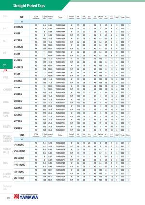 Straight Fluted Taps Intro MF TCTR Ø Hole Ø(tolerance)(mm)(mm)CodeTHCHT(chamfer)LF(mm)THL(mm) LU(mm) LS DCON K(mm)(mm)(mm)LK(mm)NOFTypeStock JIS P3 8.8 8.85 TUMR010N4 4P 75 23 - 38 7 5.5 8 3 002 f M10X1.25 SP P3 8.8 8.85 TUMR010N1 1.5P 75 23 - 38 7 5.5 8 4 002 f P3 9 9.09 TUMR010M4 4P 75 23 - 38 7 5.5 8 3 002 f M10X1 P3 9 9.09 TUMR010M1 1.5P 75 23 - 38 7 5.5 8 4 002 f P3 10.5 10.6 TUMR012O4 4P 82 26 - 42 8.5 6.5 9 3 002 f SL M12X1.5 P3 10.5 10.6 TUMR012O1 1.5P 82 26 - 42 8.5 6.5 9 4 002 f P4 10.8 10.85 TUMS012N4 4P 82 26 - 42 8.5 6.5 9 3 002 f M12X1.25 P4 10.8 10.85 TUMS012N1 1.5P 82 26 - 42 8.5 6.5 9 4 002 f PO M12X1 P3 11 11.09 TUMR012M4 4P 82 26 - 42 8.5 6.5 9 3 002 f P3 11 11.09 TUMR012M1 1.5P 82 26 - 42 8.5 6.5 9 4 002 f P3 12.5 12.6 TUMR014O4 4P 88 26 - 45 10.5 8 11 4 002 f M14X1.5 P3 12.5 12.6 TUMR014O1 1.5P 88 26 - 45 10.5 8 11 4 002 f ST P3 12.8 12.85 TUMR014N4 4P 88 26 - 45 10.5 8 11 4 002 f M14X1.25 JIS P3 12.8 12.85 TUMR014N1 1.5P 88 26 - 45 10.5 8 11 4 002 f P3 13 13.09 TUMR014M4 4P 88 26 - 45 10.5 8 11 4 002 f M14X1 P3 13 13.09 TUMR014M1 1.5P 88 26 - 45 10.5 8 11 4 002 f ROLL P3 14.5 14.6 TUMR016O4 4P 95 26 - 48 12.5 10 13 4 002 f M16X1.5 P3 14.5 14.6 TUMR016O1 1.5P 95 26 - 48 12.5 10 13 4 002 f P3 15 15.09 TUMR016M4 4P 95 26 - 48 12.5 10 13 4 002 f M16X1 CARBIDE P3 15 15.09 TUMR016M1 1.5P 95 26 - 48 12.5 10 13 4 002 f P4 16.5 16.6 TUMS018O4 4P 100 33 - 51 14 11 14 4 002 f M18X1.5 P4 16.5 16.6 TUMS018O1 1.5P 100 33 - 51 14 11 14 4 002 f P4 18.5 18.6 TUMS020O4 4P 105 33 - 50 15 12 15 4 002 f LONG M20X1.5 P4 18.5 18.6 TUMS020O1 1.5P 105 33 - 50 15 12 15 4 002 f P4 20.5 20.6 TUMS022O4 4P 115 33 - 55 17 13 16 4 002 f M22X1.5 P4 20.5 20.6 TUMS022O1 1.5P 115 33 - 55 17 13 16 4 002 f HAND P4 22.5 22.6 TUMS024O4 4P 120 39 - 55 19 15 18 4 002 f TAPS M24X1.5 P4 22.5 22.6 TUMS024O1 1.5P 120 39 - 55 19 15 18 4 002 f P4 25.5 25.6 TUMS027O4 4P 130 39 - 60 20 15 18 4 002 f M27X1.5 P4 25.5 25.6 TUMS027O1 1.5P 130 39 - 60 20 15 18 4 002 f EG (STI) P4 28.5 28.6 TUMS030O4 4P 135 46 - 62 23 17 20 4 002 f M30X1.5 P4 28.5 28.6 TUMS030O1 1.5P 135 46 - 62 23 17 20 4 002 f SPECIAL UNC TCTR Ø Hole Ø(tolerance)(mm)(mm)CodeTHCHT(chamfer)LF(mm)THL(mm) LU(mm) LS DCON K(mm)(mm)(mm)LK(mm)NOFTypeStock THREADS,GAUGES JIS P2 5.1 5.19 TUMQU04N4 4P 62 15 26 33 6 4.5 7 3 001 f 1/4-20UNC P2 5.1 5.19 TUMQU04N1 1.5P 62 15 26 33 6 4.5 7 3 001 f THREAD P3 6.6 6.65 TUMRU05O4 4P 70 19 - 36 6.2 5 8 3 002 f MILLS 5/16-18UNC P3 6.6 6.65 TUMRU05O1 1.5P 70 19 - 36 6.2 5 8 4 002 f P3 8 8.07 TUMRU06P4 4P 75 23 - 38 7 5.5 8 3 002 f 3/8-16UNC P3 8 8.07 TUMRU06P1 1.5P 75 23 - 38 7 5.5 8 4 002 f DIES 7/16-14UNC P3 9.4 9.45 TUMRU07Q4 4P 82 26 - 42 8.5 6.5 9 3 002 f P3 9.4 9.45 TUMRU07Q1 1.5P 82 26 - 42 8.5 6.5 9 4 002 f P3 10.9 10.91 TUMRU08R4 4P 88 26 - 45 10.5 8 11 3 002 f 1/2-13UNC CENTER P3 10.9 10.91 TUMRU08R1 1.5P 88 26 - 45 10.5 8 11 4 002 f DRILLS 5/8-11UNC P3 13.6 13.75 TUMRU10U4 4P 95 26 - 48 12.5 10 13 4 002 f P3 13.6 13.75 TUMRU10U1 1.5P 95 26 - 48 12.5 10 13 4 002 f Technical info 332