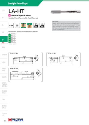 Straight Fluted Taps Intro LA-HT MS Material Specific Series SP Straight Fluted Taps for Die Cast Materials FEATURES SL HSS-E NI 5P 1.5P Material specific for blind and through hole application.Specific design and NI treatment allow stable and longTHCHTTHCHTlife on Aluminium, Aluminium casting and die-casting. 1.5P chamfer for blind hole application, 5P chamfer for through hole application. PO Recommended Tapping Speeds Depending On Materials ISO Vc (m/min) N1 5÷15 H N2 5÷15 H ST N3 5÷10 H N4 5÷10 H JIS H 1st choice I suitable ROLL JIS-LA-HT TYPE: HT_005 TYPE: HT_001 CARBIDE KDCON DCON K THL LS LK KLONGLF THLLU LKLS KLF HAND TYPE: HT_002 TAPS KDCON EG (STI) THL LK KLS LF SPECIAL THREADS, GAUGES THREAD MILLS DIES CENTER DRILLS Technical info 334