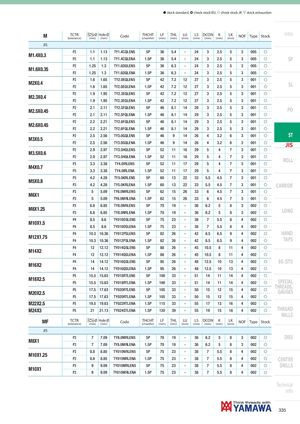 h stock standard, ) check stock EU, f check stock JP, m stock exhaustion M TCTR Ø Hole Ø(tolerance)(mm)(mm)CodeTHCHT(chamfer)LF(mm)THL(mm) LU(mm) LS DCON K(mm)(mm)(mm)LK(mm)NOFTypeStock Intro JIS P2 1.1 1.13 TY1.4CQLEN5 5P 36 5.4 - 24 3 2.5 5 3 005 f M1.4X0.3 P2 1.1 1.13 TY1.4CQLENA 1.5P 36 5.4 - 24 3 2.5 5 3 005 f SP P2 1.25 1.3 TY1.6DQLEN5 5P 36 6.3 - 24 3 2.5 5 3 005 f M1.6X0.35 P2 1.25 1.3 TY1.6DQLENA 1.5P 36 6.3 - 24 3 2.5 5 3 005 f P2 1.6 1.65 TY2.0EQLEN5 5P 42 7.2 12 27 3 2.5 5 3 001 f M2X0.4 P2 1.6 1.65 TY2.0EQLENA 1.5P 42 7.2 12 27 3 2.5 5 3 001 f SL P2 1.9 1.95 TY2.3EQLEN5 5P 42 7.2 12 27 3 2.5 5 3 001 f M2.3X0.4 P2 1.9 1.95 TY2.3EQLENA 1.5P 42 7.2 12 27 3 2.5 5 3 001 f M2.5X0.45 P2 2.1 2.11 TY2.5FQLEN5 5P 46 8.1 14 29 3 2.5 5 3 001 f PO P2 2.1 2.11 TY2.5FQLENA 1.5P 46 8.1 14 29 3 2.5 5 3 001 f P2 2.2 2.21 TY2.6FQLEN5 5P 46 8.1 14 29 3 2.5 5 3 001 f M2.6X0.45 P2 2.2 2.21 TY2.6FQLENA 1.5P 46 8.1 14 29 3 2.5 5 3 001 f P2 2.5 2.56 TY3.0GQLEN5 5P 46 9 14 26 4 3.2 6 3 001 f ST M3X0.5 P2 2.5 2.56 TY3.0GQLENA 1.5P 46 9 14 26 4 3.2 6 3 001 f JIS P2 2.9 2.97 TY3.5HQLEN5 5P 52 11 16 29 5 4 7 3 001 f M3.5X0.6 P2 2.9 2.97 TY3.5HQLENA 1.5P 52 11 16 29 5 4 7 3 001 f P3 3.3 3.38 TY4.0IRLEN5 5P 52 11 17 29 5 4 7 3 001 f ROLL M4X0.7 P3 3.3 3.38 TY4.0IRLENA 1.5P 52 11 17 29 5 4 7 3 001 f P3 4.2 4.28 TY5.0KRLEN5 5P 60 13 22 33 5.5 4.5 7 3 001 f M5X0.8 P3 4.2 4.28 TY5.0KRLENA 1.5P 60 13 22 33 5.5 4.5 7 3 001 f CARBIDE P3 5 5.09 TY6.0MRLEN5 5P 62 15 26 33 6 4.5 7 3 001 f M6X1 P3 5 5.09 TY6.0MRLENA 1.5P 62 15 26 33 6 4.5 7 3 001 f P3 6.8 6.85 TY8.0NRLEN5 5P 70 19 - 36 6.2 5 8 3 002 f M8X1.25 P3 6.8 6.85 TY8.0NRLENA 1.5P 70 19 - 36 6.2 5 8 3 002 f LONG P4 8.5 8.6 TY010OSLEN5 5P 75 23 - 38 7 5.5 8 4 002 f M10X1.5 P4 8.5 8.6 TY010OSLENA 1.5P 75 23 - 38 7 5.5 8 4 002 f P4 10.3 10.36 TY012PSLEN5 5P 82 26 - 42 8.5 6.5 9 4 002 f HAND M12X1.75 P4 10.3 10.36 TY012PSLENA 1.5P 82 26 - 42 8.5 6.5 9 4 002 f TAPS P4 12 12.12 TY014QSLEN5 5P 88 26 - 45 10.5 8 11 4 002 f M14X2 P4 12 12.12 TY014QSLENA 1.5P 88 26 - 45 10.5 8 11 4 002 f P4 14 14.12 TY016QSLEN5 5P 95 26 - 48 12.5 10 13 4 002 f EG (STI) M16X2 P4 14 14.12 TY016QSLENA 1.5P 95 26 - 48 12.5 10 13 4 002 f P5 15.5 15.63 TY018RTLEN5 5P 100 33 - 51 14 11 14 4 002 f M18X2.5 P5 15.5 15.63 TY018RTLENA 1.5P 100 33 - 51 14 11 14 4 002 f SPECIAL M20X2.5 P5 17.5 17.63 TY020RTLEN5 5P 105 33 - 50 15 12 15 4 002 f THREADS,GAUGES P5 17.5 17.63 TY020RTLENA 1.5P 105 33 - 50 15 12 15 4 002 f M22X2.5 P5 19.5 19.63 TY022RTLENA 1.5P 115 33 - 55 17 13 16 4 002 f M24X3 P5 21 21.13 TY024STLENA 1.5P 120 39 - 55 19 15 18 4 002 f THREAD MILLS MF TCTR Ø Hole Ø(tolerance)(mm)(mm)CodeTHCHT(chamfer)LF(mm)THL(mm) LU(mm) LS DCON K(mm)(mm)(mm)LK(mm)NOFTypeStock JIS M8X1 P3 7 7.09 TY8.0MRLEN5 5P 70 19 - 36 6.2 5 8 3 002 f DIES P3 7 7.09 TY8.0MRLENA 1.5P 70 19 - 36 6.2 5 8 3 002 f P3 8.8 8.85 TY010NRLEN5 5P 75 23 - 38 7 5.5 8 4 002 f M10X1.25 P3 8.8 8.85 TY010NRLENA 1.5P 75 23 - 38 7 5.5 8 4 002 f CENTER M10X1 P3 9 9.09 TY010MRLEN5 5P 75 23 - 38 7 5.5 8 4 002 f DRILLS P3 9 9.09 TY010MRLENA 1.5P 75 23 - 38 7 5.5 8 4 002 f Technical info 335
