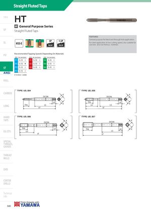 Straight Fluted Taps Intro HT GP General Purpose Series SP Straight Fluted Taps FEATURES SL HSS-E 5P 1.5PTHCHTTHCHT General purpose for blind and through hole application.For steel application at low cutting speed, also suitable forcast iron and non-ferrous materials. PO Recommended Tapping Speeds Depending On Materials ISO Vc (m/min) ISO Vc (m/min) ISO Vc (m/min) P1 5÷10 I K1 5÷10 I N2 5÷10 I P2 5÷10 H K2 5÷10 I N3 5÷10 I ST P3 5÷10 I K3 5÷10 I N4 5÷10 I P4 5÷10 I ANSI H 1st choice I suitable ROLL ANSI-HT TYPE: US_004 TYPE: US_005 CARBIDE K K DCON DCON LONG THL LKLS KLF THLLU LKLS KLF HAND TYPE: US_006 TYPE: US_007 TAPS KDCON KDCON THLEG (STI)LU LK K THL LK KLS LF LF SPECIAL THREADS, GAUGES THREAD MILLS DIES CENTER DRILLS Technical info 340