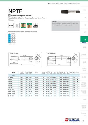 h stock standard, ) check stock EU, f check stock JP, m stock exhaustion NPTF Intro GP General Purpose Series Straight Fluted Taps for American Dryseal Taper Pipe SP Threads FEATURES HSS-E OX 3P General purpose for blind and through hole application.For steel application at low cutting speed. SLTHCHT Recommended Tapping Speeds Depending On Materials PO ISO Vc (m/min) P1 ≤5 H P2 ≤5 H P3 ≤5 I ST P4 ≤5 I ANSI H 1st choice I suitable ROLL ANSI-NPTF TYPE: US_055 TYPE: US_056 DCON K K CARBIDEDCON THL LK K THL LK K LONG LF LF HAND TAPS NPTF TCTR Ø Hole Ø(tolerance)(mm)(mm)CodeTHCHT(chamfer)Basicmajor Ø(mm)LF(inch)THL(inch)LSDCON K(inch)(inch)(inch)LK(inch)NOFType Stock ANSI 1/16-27 ANSI G 5.95 5.99 Y83125 3P 7.770 2.125 0.687 - 0.31 0.234 0.375 4 055 f EG (STI) 1/8-27 ANSI G 8.3 8.34 Y83126 3P 10.117 2.125 0.75 - 0.44 0.328 0.375 4 055 h 1/4-18 ANSI G 10.7 10.75 Y83128 3P 13.426 2.437 1.062 - 0.56 0.421 0.437 4 055 h 3/8-181/2-14 ANSI G 14.1 14.17 Y83129 3P 16.866 2.562 1.062 - 0.7 0.531 0.5 4 055 f SPECIALTHREADS,ANSI G17.417.44Y831303P20.9803.1251.375-0.690.5150.6254056fGAUGES 3/4-14 ANSI G 22.7 22.75 Y83131 3P 26.325 3.25 1.375 - 0.91 0.679 0.687 5 056 f 1 -11 1/2 ANSI G 28.5 28.6 Y83132 3P 32.934 3.75 1.75 - 1.13 0.843 0.812 5 056 f 1 1/4-11 1/21 1/2-11 1/2 ANSI G 37.3 37.33 Y83133 3P 41.689 4 1.75 - 1.31 0.984 0.937 5 056 f THREADANSI G43.343.4Y831343P47.7604.251.75-1.51.12516056fMILLS 2 -11 1/2 ANSI G 55.4 55.41 Y83135 3P 59.797 4.5 1.75 - 1.88 1.406 1.125 6 056 f DIES CENTER DRILLS Technical info 347