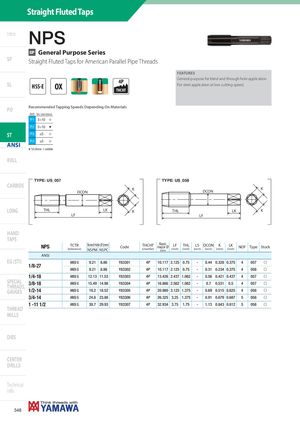 Straight Fluted Taps Intro NPS GP General Purpose Series SP Straight Fluted Taps for American Parallel Pipe Threads FEATURES SL HSS-E OX 4P General purpose for blind and through hole application.For steel application at low cutting speed.THCHT PO Recommended Tapping Speeds Depending On Materials ISO Vc (m/min) P1 5÷10 I P2 5÷10 H ST P3 ≤5 I P4 ≤5 I ANSI H 1st choice I suitable ROLL ANSI-NPS TYPE: US_057 TYPE: US_058 CARBIDE DCON K DCON K LONG THL LK K THL LK K LF LF HAND TAPS NPS TCTR Bored Hole Ø (mm)(tolerance)NSPM NSPCCodeTHCHT(chamfer)Basicmajor Ø(mm)LF(inch)THL(inch)LSDCON K(inch)(inch)(inch)LK(inch)NOFType Stock ANSI EG (STI) ANSI G 9.21 8.86 Y83301 4P 10.117 2.125 0.75 - 0.44 0.328 0.375 4 057 f 1/8-27 ANSI G 9.21 8.86 Y83302 4P 10.117 2.125 0.75 - 0.31 0.234 0.375 4 058 f 1/4-18 ANSI G 12.13 11.53 Y83303 4P 13.426 2.437 1.062 - 0.56 0.421 0.437 4 057 f SPECIALTHREADS,GAUGES3/8-181/2-14 ANSI G 15.49 14.98 Y83304 4P 16.866 2.562 1.062 - 0.7 0.531 0.5 4 057 fANSI G19.218.52Y833054P20.9803.1251.375-0.690.5150.6254058f 3/4-14 ANSI G 24.6 23.88 Y83306 4P 26.325 3.25 1.375 - 0.91 0.679 0.687 5 058 f 1 -11 1/2 ANSI G 30.7 29.93 Y83307 4P 32.934 3.75 1.75 - 1.13 0.843 0.812 5 058 f THREAD MILLS DIES CENTER DRILLS Technical info 348