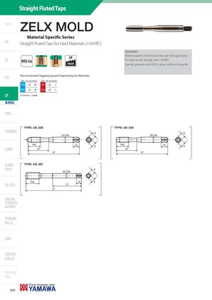 Straight Fluted Taps Intro ZELX MOLD Material Specific Series SP Straight Fluted Taps for Hard Materials (<45HRC) FEATURES SL HSS-Co 5P Material specific for blind and through hole application.For high tensile strength steel <45HRC. THCHT Specific geometry and HSSCo allow stable and long life. PO Recommended Tapping Speeds Depending On Materials ISO Vc (m/min) ISO Vc (m/min) P5 ≤5 H K2 ≤5 I P6 ≤5 H K3 ≤5 I ST H 1st choice I suitable ANSI ROLL ANSI-ZELX MOLD TYPE: US_030 TYPE: US_042 CARBIDE K K DCON DCON THL LK K THL LK K LONG LU LU LF LF HAND TYPE: US_007 TAPS K DCON THL LK K EG (STI) LS LF SPECIAL THREADS, GAUGES THREAD MILLS DIES CENTER DRILLS Technical info 350