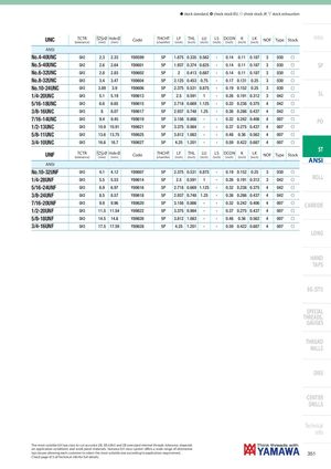 h stock standard, ) check stock EU, f check stock JP, m stock exhaustion UNC TCTR Ø Hole Ø(tolerance)(mm)(mm)CodeTHCHT(chamfer)LF(inch) THL(inch) LU(inch) LS DCON K(inch)(inch)(inch)LK(inch)NOFTypeStockIntro ANSI No.4-40UNC GH2 2.3 2.33 Y89599 5P 1.875 0.335 0.562 - 0.14 0.11 0.187 3 030 f No.5-40UNC GH2 2.6 2.64 Y89601 5P 1.937 0.374 0.625 - 0.14 0.11 0.187 3 030 f SP No.6-32UNC GH3 2.8 2.83 Y89602 5P 2 0.413 0.687 - 0.14 0.11 0.187 3 030 f No.8-32UNC GH3 3.4 3.47 Y89604 5P 2.125 0.453 0.75 - 0.17 0.131 0.25 3 030 f No.10-24UNC GH3 3.89 3.9 Y89606 5P 2.375 0.531 0.875 - 0.19 0.152 0.25 3 030 f 1/4-20UNC GH3 5.1 5.19 Y89613 5P 2.5 0.591 1 - 0.26 0.191 0.312 3 042 f SL 5/16-18UNC GH3 6.6 6.65 Y89615 5P 2.718 0.669 1.125 - 0.32 0.238 0.375 4 042 f 3/8-16UNC GH3 8 8.07 Y89617 5P 2.937 0.748 1.25 - 0.38 0.286 0.437 4 042 f 7/16-14UNC GH3 9.4 9.45 Y89619 5P 3.156 0.866 - - 0.32 0.242 0.406 4 007 f PO 1/2-13UNC GH3 10.9 10.91 Y89621 5P 3.375 0.984 - - 0.37 0.275 0.437 4 007 f 5/8-11UNC GH3 13.6 13.75 Y89625 5P 3.812 1.083 - - 0.48 0.36 0.562 4 007 f 3/4-10UNC GH3 16.6 16.7 Y89627 5P 4.25 1.201 - - 0.59 0.422 0.687 4 007 f ST UNF TCTR Ø Hole Ø(tolerance)(mm)(mm)CodeTHCHT(chamfer)LF(inch) THL(inch) LU(inch) LS DCON K(inch)(inch)(inch)LK(inch)NOFTypeStockANSI ANSI No.10-32UNF GH3 4.1 4.12 Y89607 5P 2.375 0.531 0.875 - 0.19 0.152 0.25 3 030 f 1/4-28UNF GH3 5.5 5.53 Y89614 5P 2.5 0.591 1 - 0.26 0.191 0.312 3 042 f ROLL 5/16-24UNF GH3 6.9 6.97 Y89616 5P 2.718 0.669 1.125 - 0.32 0.238 0.375 4 042 f 3/8-24UNF GH3 8.5 8.57 Y89618 5P 2.937 0.748 1.25 - 0.38 0.286 0.437 4 042 f 7/16-20UNF GH3 9.9 9.96 Y89620 5P 3.156 0.866 - - 0.32 0.242 0.406 4 007 f CARBIDE 1/2-20UNF GH3 11.5 11.54 Y89622 5P 3.375 0.984 - - 0.37 0.275 0.437 4 007 f 5/8-18UNF GH3 14.5 14.6 Y89626 5P 3.812 1.083 - - 0.48 0.36 0.562 4 007 f 3/4-16UNF GH3 17.5 17.59 Y89628 5P 4.25 1.201 - - 0.59 0.422 0.687 4 007 f LONG HAND TAPS EG (STI) SPECIAL THREADS, GAUGES THREAD MILLS DIES CENTER DRILLS Technical info The most suitable GH tap class to cut accurate 2B, 3B (UNJ) and 2B oversized internal threads tolerance, depends on application conditions and work-piece materials. Yamawa GH class system offers a wide range of alternative tap classes allowing each customer to select the most suitable one according to application requirement. 351 Check page 673 of Technical info for full details.