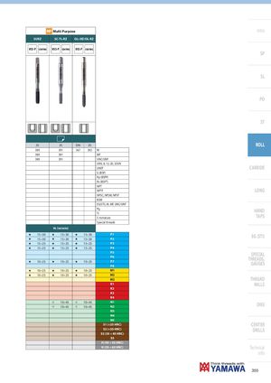 MP Multi Purpose Intro SURZ SC-TL-RZ OL+RZ/OL-RZ HSS-P COATING HSS-P COATING HSS-P COATING SP SL PO ST JIS JIS DIN JIS ROLL 389 391 367 392 M 389 391 MF 389 391 UNC/UNF UNS, 8, 12, 20, 32UN UNEF CARBIDE G (BSP) Rp (BSPP) Rc (BSPT) NPT NPTF LONG NPSC, NPSM, NPSF BSW EG(STI), M, MF, UNC/UNF Pg HAND TrS miniature TAPS Special threads Vc (m/min) H 15÷30 H 15÷30 H 15÷30 P1H15÷30H15÷30H15÷30P2 EG (STI) H 15÷25 H 15÷25 H 15÷25 P3 H 15÷25 H 15÷25 H 15÷25 P4 P5P6H10÷25H10÷25H10÷25P7P8 SPECIALTHREADS,GAUGES H 10÷25 H 10÷25 H 10÷25 M1 H 10÷25 H 10÷25 H 10÷25 M2 M3 THREAD K1 MILLS K2 K3 K4 I 10÷45 I 10÷45 N1I10÷45I10÷45N2 DIES N3 N4 N5 S1 (<25 HRC) CENTER S2 (<35 HRC) DRILLS S3 (35 ÷ 45 HRC) S5 H (45 ÷ 55 HRC) H (55 ÷ 63 HRC) Technical info 355