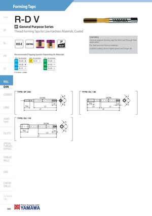 Forming Taps Intro R-D V GP General Purpose Series SP Thread Forming Taps for Low Hardness Materials, Coated FEATURES SL HSS-E COATING 2PTHCHT General purpose forming taps for blind and through holeapplication.For steel and non-ferrous materials. Suitable coating allows higher speed and longer life. PO Recommended Tapping Speeds Depending On Materials ISO Vc (m/min) ISO Vc (m/min) ISO Vc (m/min) P1 10÷20 H M1 8÷12 I N1 10÷20 I P2 10÷20 H N2 10÷20 I ST P7 8÷12 I N3 10÷20 I H 1st choice I suitable ROLL DIN DIN-R-D V TYPE: SP_025 TYPE: EU_136 CARBIDE KDCON DCON K LONG THL LKLS K THL LK KLULS LF LF HAND TYPE: EU_116 TAPS K DCON THLEG (STI) LKLS K LF SPECIAL THREADS, GAUGES THREAD MILLS DIES CENTER DRILLS Technical info 360
