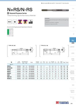 h stock standard, ) check stock EU, f check stock JP, m stock exhaustion N+RS/N-RS Intro GP General Purpose Series Thread Forming Taps for Non-Ferrous Materials SP FEATURES HSS-E NI 2P General purpose forming taps for blind and through holeapplication. SLTHCHTSuitable for non-ferrous materials. NI treatment improves tool life. Recommended Tapping Speeds Depending On Materials PO ISO Vc (m/min) N1 5÷15 H N2 5÷15 H N3 5÷15 H ST H 1st choice I suitable ROLL DIN-N+RS/N-RS DIN TYPE: SP_025 TYPE: EU_136 KDCON CARBIDEDCONK THL LKLS K THL LK KLULS LONG LF LF HAND TAPS M TCTR Bored Hole Ø (mm)(tolerance)MaxMinCodeTHCHT(chamfer)LF(mm)THL(mm) LU(mm) LS DCON K(mm)(mm)(mm)LK(mm)NOF(Lobes)Type Stock DIN 371 M2X0.4 ISO2X(6HX) 1.86 1.8 RE2.0EBKENB 2P 45 8 - 32 2.8 2.1 5 0(4) 025 h EG (STI) M2.5X0.45 ISO2X(6HX) 2.34 2.27 RE2.5FBKENB 2P 50 8 15 33 2.8 2.1 5 0(4) 136 h M3X0.5 ISO2X(6HX) 2.83 2.76 RE3.0GBKENB 2P 56 9 18 34 3.5 2.7 6 1(4) 136 h M4X0.7M5X0.8 ISO2X(6HX) 3.75 3.66 RE4.0IBKENB 2P 63 13 21 38 4.5 3.4 6 1(4) 136 h SPECIALTHREADS,ISO2X(6HX)4.74.6RE5.0KBKENB2P7014253964.981(4)136hGAUGES M6X1 ISO2X(6HX) 5.61 5.5 RE6.0MBKENB 2P 80 15 30 45 6 4.9 8 1(4) 136 h M8X1.25 ISO2X(6HX) 7.52 7.38 RD8.0NBKENB 2P 90 19 35 47 8 6.2 9 1(6) 136 h M10X1.5 ISO2X(6HX) 9.41 9.26 RD010OBKENB 2P 100 23 39 52 10 8 11 1(6) 136 h THREADMILLS DIES CENTER DRILLS Technical info 363