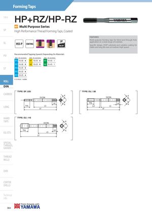 Forming Taps Intro HP+RZ/HP-RZ MP Multi Purpose Series SP High Performance Thread Forming Taps, Coated FEATURES SL HSS-P COATING 2PTHCHT Multi purpose forming taps for blind and through holeapplication on a wide range of materials.Specific design, HSSP substrate and suitable coating forstable and long life even at medium-high speed. PO Recommended Tapping Speeds Depending On Materials ISO Vc (m/min) ISO Vc (m/min) ISO Vc (m/min) P1 15÷30 H M1 10÷25 H N1 10÷45 I P2 15÷30 H M2 10÷25 H N2 10÷45 I ST P3 15÷25 H P4 15÷25 H P7 10÷25 H H 1st choice I suitable ROLL DIN DIN-HP+RZ/HP-RZ TYPE: SP_025 TYPE: EU_136 CARBIDE KDCON DCON K LONG THL LKLS K THL LK KLULS LF LF HAND TYPE: EU_116 TAPS K DCON THLEG (STI) LKLS K LF SPECIAL THREADS, GAUGES THREAD MILLS DIES CENTER DRILLS Technical info 364