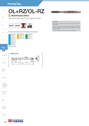 Forming Taps Intro OL+RZ/OL-RZ MP Multi Purpose Series SP Thread Forming Taps for Dry Tapping, Coated FEATURES SL HSS-P COATING 4PTHCHT Dry Series forming taps for blind and through holeapplication.Specific design, HSSP substrate and suitable coating forstable and long life even in difficult condition such as dry or MQL tapping. For steel, stainless steel and non-ferrous materials. PO Recommended Tapping Speeds Depending On Materials ISO Vc (m/min) ISO Vc (m/min) ISO Vc (m/min) P1 15÷30 H M1 10÷25 H N1 10÷45 I P2 15÷30 H M2 10÷25 H N2 10÷45 I ST P3 15÷25 H P4 15÷25 H P7 10÷25 H H 1st choice I suitable ROLL DIN DIN-OL+RZ/OL-RZ TYPE: EU_139 CARBIDE K DCON THL LK K LONG LU LSLF HAND TAPS EG (STI) SPECIAL THREADS, GAUGES THREAD MILLS DIES CENTER DRILLS Technical info 366