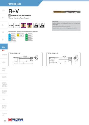 Forming Taps Intro R+V GP General Purpose Series SP Thread Forming Taps, Coated FEATURES SL HSS-E COATING 4P 2P General purpose forming taps for blind and through holeapplication.THCHTTHCHTFor ferrous and non-ferrous materials. Suitable coating prevents welding and extends life. PO Recommended Tapping Speeds Depending On Materials ISO Vc (m/min) ISO Vc (m/min) ISO Vc (m/min) P1 10÷20 H M1 5÷12 I N1 10÷20 I P2 10÷20 H N2 10÷20 I ST P7 5÷12 I N3 10÷20 I H 1st choice I suitable ROLL JIS JIS-R+V TYPE: ROLL_010 TYPE: ROLL_012 CARBIDE DCON K KDCON LK KLONGTHLLSLF THLLU LKLS KLF HAND TAPS EG (STI) SPECIAL THREADS, GAUGES THREAD MILLS DIES CENTER DRILLS Technical info 368