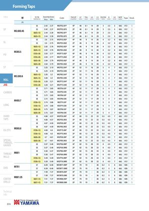 Forming Taps Intro M TCTR Bored Hole Ø (mm)(tolerance)MaxMinCodeTHCHT(chamfer)LF(mm)THL(mm) LU(mm) LS DCON K(mm)(mm)(mm)LK(mm)NOF(Lobes)TypeStock JIS G5 2.42 2.37 NRZP52.6FP 4P 46 8.1 14 29 3 2.5 5 0(4) 012 f SP M2.6X0.45 G5 2.42 2.37 NRZP52.6FB 2P 46 8.1 14 29 3 2.5 5 0(4) 012 f G6(G5+13) 2.44 2.39 NRZP62.6FP 4P 46 8.1 14 29 3 2.5 5 0(4) 012 f G6(G5+13) 2.44 2.39 NRZP62.6FB 2P 46 8.1 14 29 3 2.5 5 0(4) 012 f G5 2.8 2.75 NRZP53.0GP 4P 46 9 14 26 4 3.2 6 4(4) 012 f SL G5 2.8 2.75 NRZP53.0GB 2P 46 9 14 26 4 3.2 6 4(4) 012 f G6(G5+13) 2.82 2.76 NRZP63.0GP 4P 46 9 14 26 4 3.2 6 4(4) 012 f G6(G5+13) 2.82 2.76 NRZP63.0GB 2P 46 9 14 26 4 3.2 6 4(4) 012 f M3X0.5 PO G7(G5+26) 2.83 2.77 NRZP73.0GP 4P 46 9 14 26 4 3.2 6 4(4) 012 f G7(G5+26) 2.83 2.77 NRZP73.0GB 2P 46 9 14 26 4 3.2 6 4(4) 012 f G8(G5+39) 2.84 2.79 NRZP83.0GP 4P 46 9 14 26 4 3.2 6 4(4) 012 f G8(G5+39) 2.84 2.79 NRZP83.0GB 2P 46 9 14 26 4 3.2 6 4(4) 012 f ST G5 3.25 3.19 NRZP53.5HP 4P 52 11 16 29 5 4 7 4(4) 012 f G5 3.25 3.19 NRZP53.5HB 2P 52 11 16 29 5 4 7 4(4) 012 f G6(G5+13) 3.26 3.2 NRZP63.5HP 4P 52 11 16 29 5 4 7 4(4) 012 f M3.5X0.6 G6(G5+13) 3.26 3.2 NRZP63.5HB 2P 52 11 16 29 5 4 7 4(4) 012 f ROLL G7(G5+26) 3.28 3.21 NRZP73.5HP 4P 52 11 16 29 5 4 7 4(4) 012 f JIS G7(G5+26) 3.28 3.21 NRZP73.5HB 2P 52 11 16 29 5 4 7 4(4) 012 f G5 3.71 3.65 NRZP54.0IP 4P 52 11 17 29 5 4 7 4(4) 012 f CARBIDE G5 3.71 3.65 NRZP54.0IB 2P 52 11 17 29 5 4 7 4(4) 012 f G6 3.72 3.65 NRZP64.0IP 4P 52 11 17 29 5 4 7 4(4) 012 f G6 3.72 3.65 NRZP64.0IB 2P 52 11 17 29 5 4 7 4(4) 012 f M4X0.7 G7(G6+13) 3.74 3.66 NRZP74.0IP 4P 52 11 17 29 5 4 7 4(4) 012 f LONG G7(G6+13) 3.74 3.66 NRZP74.0IB 2P 52 11 17 29 5 4 7 4(4) 012 f G8(G6+26) 3.75 3.67 NRZP84.0IP 4P 52 11 17 29 5 4 7 4(4) 012 f G8(G6+26) 3.75 3.67 NRZP84.0IB 2P 52 11 17 29 5 4 7 4(4) 012 f HAND G5 4.66 4.57 NRZP55.0KP 4P 60 13 22 33 5.5 4.5 7 4(4) 012 f TAPS G5 4.66 4.57 NRZP55.0KB 2P 60 13 22 33 5.5 4.5 7 4(4) 012 f G6 4.67 4.59 NRZP65.0KP 4P 60 13 22 33 5.5 4.5 7 4(4) 012 f G6 4.67 4.59 NRZP65.0KB 2P 60 13 22 33 5.5 4.5 7 4(4) 012 f EG (STI) M5X0.8 G7(G6+13) 4.68 4.6 NRZP75.0KP 4P 60 13 22 33 5.5 4.5 7 4(4) 012 f G7(G6+13) 4.68 4.6 NRZP75.0KB 2P 60 13 22 33 5.5 4.5 7 4(4) 012 f G8(G6+26) 4.7 4.61 NRZP85.0KP 4P 60 13 22 33 5.5 4.5 7 4(4) 012 f SPECIAL G8(G6+26) 4.7 4.61 NRZP85.0KB 2P 60 13 22 33 5.5 4.5 7 4(4) 012 f THREADS,GAUGES G5 5.57 5.46 NRZP56.0MP 4P 62 15 26 33 6 4.5 7 4(4) 012 f G5 5.57 5.46 NRZP56.0MB 2P 62 15 26 33 6 4.5 7 4(4) 012 f G6 5.58 5.47 NRZP66.0MP 4P 62 15 26 33 6 4.5 7 4(4) 012 f THREAD M6X1 G6 5.58 5.47 NRZP66.0MB 2P 62 15 26 33 6 4.5 7 4(4) 012 f MILLS G7(G6+13) 5.59 5.49 NRZP76.0MP 4P 62 15 26 33 6 4.5 7 4(4) 012 f G7(G6+13) 5.59 5.49 NRZP76.0MB 2P 62 15 26 33 6 4.5 7 4(4) 012 f G7 6.59 6.48 NRZM77.0MP 4P 70 19 - 36 6.2 5 8 4(4) 026 f DIES M7X1 G7 6.59 6.48 NRZM77.0MB 2P 70 19 - 36 6.2 5 8 4(4) 026 f G7 7.49 7.37 NRZM78.0NP 4P 70 19 - 36 6.2 5 8 3(6) 026 f G7 7.49 7.37 NRZM78.0NB 2P 70 19 - 36 6.2 5 8 3(6) 026 f CENTER M8X1.25 G8(G7+13) 7.51 7.37 NRZM88.0NP 4P 70 19 - 36 6.2 5 8 3(6) 026 f DRILLS G8(G7+13) 7.51 7.37 NRZM88.0NB 2P 70 19 - 36 6.2 5 8 3(6) 026 f Technical info 374