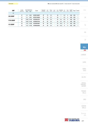 Oversized h stock standard, ) check stock EU, f check stock JP, m stock exhaustion UNF TCTR Bored Hole Ø (mm)(tolerance)MaxMinCodeTHCHT(chamfer)LF(mm)THL(mm) LU(mm) LS DCON K(mm)(mm)(mm)LK(mm)NOF(Lobes)TypeStock Intro JIS G7 9.1 8.99 NRZM7U06MP 4P 75 23 - 38 7 5.5 8 3(6) 026 f 3/8-24UNF G7 9.1 8.99 NRZM7U06MB 2P 75 23 - 38 7 5.5 8 3(6) 026 f SP G8 10.62 10.48 NRZM8U07NP 4P 82 26 - 42 8.5 6.5 9 4(8) 026 f 7/16-20UNF G8 10.62 10.48 NRZM8U07NB 2P 82 26 - 42 8.5 6.5 9 4(8) 026 f G8 12.2 12.06 NRZM8U08NP 4P 88 26 - 45 10.5 8 11 4(8) 026 f 1/2-20UNF G8 12.2 12.06 NRZM8U08NB 2P 88 26 - 45 10.5 8 11 4(8) 026 f SL PO ST ROLL JIS CARBIDE LONG HAND TAPS EG (STI) SPECIAL THREADS, GAUGES THREAD MILLS DIES CENTER DRILLS Technical info 377
