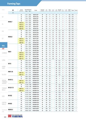 Forming Taps Intro M TCTR Bored Hole Ø (mm)(tolerance)MaxMinCodeTHCHT(chamfer)LF(mm)THL(mm) LU(mm) LS DCON K(mm)(mm)(mm)LK(mm)NOF(Lobes)TypeStock JIS G5 3.71 3.65 NRSP54.0IP 4P 52 11 17 29 5 4 7 1(4) 012 f SP G5 3.71 3.65 NRSP54.0IB 2P 52 11 17 29 5 4 7 1(4) 012 f G6 3.72 3.65 NRSP64.0IP 4P 52 11 17 29 5 4 7 1(4) 012 f G6 3.72 3.65 NRSP64.0IB 2P 52 11 17 29 5 4 7 1(4) 012 f M4X0.7 G7(G6+13) 3.74 3.66 NRSP74.0IP 4P 52 11 17 29 5 4 7 1(4) 012 f SL G7(G6+13) 3.74 3.66 NRSP74.0IB 2P 52 11 17 29 5 4 7 1(4) 012 f G8(G6+26) 3.75 3.67 NRSP84.0IP 4P 52 11 17 29 5 4 7 1(4) 012 f G8(G6+26) 3.75 3.67 NRSP84.0IB 2P 52 11 17 29 5 4 7 1(4) 012 f PO G5 4.66 4.57 NRSP55.0KP 4P 60 13 22 33 5.5 4.5 7 1(4) 012 f G5 4.66 4.57 NRSP55.0KB 2P 60 13 22 33 5.5 4.5 7 1(4) 012 f G6 4.67 4.59 NRSP65.0KP 4P 60 13 22 33 5.5 4.5 7 1(4) 012 f M5X0.8 G6 4.67 4.59 NRSP65.0KB 2P 60 13 22 33 5.5 4.5 7 1(4) 012 f ST G7(G6+13) 4.68 4.6 NRSP75.0KP 4P 60 13 22 33 5.5 4.5 7 1(4) 012 f G7(G6+13) 4.68 4.6 NRSP75.0KB 2P 60 13 22 33 5.5 4.5 7 1(4) 012 f G8(G6+26) 4.7 4.61 NRSP85.0KB 2P 60 13 22 33 5.5 4.5 7 1(4) 012 f G5 5.57 5.46 NRSP56.0MP 4P 62 15 26 33 6 4.5 7 1(4) 012 f ROLL G5 5.57 5.46 NRSP56.0MB 2P 62 15 26 33 6 4.5 7 1(4) 012 f JIS G6 5.58 5.47 NRSP66.0MP 4P 62 15 26 33 6 4.5 7 1(4) 012 f G6 5.58 5.47 NRSP66.0MB 2P 62 15 26 33 6 4.5 7 1(4) 012 f M6X1 CARBIDE G7(G6+13) 5.59 5.49 NRSP76.0MP 4P 62 15 26 33 6 4.5 7 1(4) 012 f G7(G6+13) 5.59 5.49 NRSP76.0MB 2P 62 15 26 33 6 4.5 7 1(4) 012 f G8(G7+13) 5.61 5.5 NRSP86.0MP 4P 62 15 26 33 6 4.5 7 1(4) 012 f G8(G7+13) 5.61 5.5 NRSP86.0MB 2P 62 15 26 33 6 4.5 7 1(4) 012 f LONG G6 6.58 6.47 NRSM67.0MP 4P 70 19 - 36 6.2 5 8 1(4) 026 f G6 6.58 6.47 NRSM67.0MB 2P 70 19 - 36 6.2 5 8 1(4) 026 f M7X1 G7 6.59 6.48 NRSM77.0MP 4P 70 19 - 36 6.2 5 8 1(4) 026 f HAND G7 6.59 6.48 NRSM77.0MB 2P 70 19 - 36 6.2 5 8 1(4) 026 f TAPS G7 7.49 7.37 NRSM78.0NP 4P 70 19 - 36 6.2 5 8 1(6) 026 f G7 7.49 7.37 NRSM78.0NB 2P 70 19 - 36 6.2 5 8 1(6) 026 f M8X1.25 G8(G7+13) 7.51 7.37 NRSM88.0NP 4P 70 19 - 36 6.2 5 8 1(6) 026 f EG (STI) G8(G7+13) 7.51 7.37 NRSM88.0NB 2P 70 19 - 36 6.2 5 8 1(6) 026 f G7 9.38 9.22 NRSM7010OP 4P 75 23 - 38 7 5.5 8 1(6) 026 f G7 9.38 9.22 NRSM7010OB 2P 75 23 - 38 7 5.5 8 1(6) 026 f SPECIAL M10X1.5 G8(G7+13) 9.39 9.23 NRSM8010OP 4P 75 23 - 38 7 5.5 8 1(6) 026 f THREADS,GAUGES G8(G7+13) 9.39 9.23 NRSM8010OB 2P 75 23 - 38 7 5.5 8 1(6) 026 f G8 11.28 11.09 NRSM8012PP 4P 82 26 - 42 8.5 6.5 9 1(6) 026 f G8 11.28 11.09 NRSM8012PB 2P 82 26 - 42 8.5 6.5 9 1(6) 026 f THREAD M12X1.75 G9(G8+13) 11.29 11.11 NRSM9012PP 4P 82 26 - 42 8.5 6.5 9 1(6) 026 f MILLS G9(G8+13) 11.29 11.11 NRSM9012PB 2P 82 26 - 42 8.5 6.5 9 1(6) 026 f G9 13.18 12.97 NRSM9014QP 4P 88 26 - 45 10.5 8 11 1(6) 026 f G9 13.18 12.97 NRSM9014QB 2P 88 26 - 45 10.5 8 11 1(6) 026 f DIES M14X2 G10 13.19 12.98 NRSM0014QP 4P 88 26 - 45 10.5 8 11 1(6) 026 f G10 13.19 12.98 NRSM0014QB 2P 88 26 - 45 10.5 8 11 1(6) 026 f G9 15.18 14.96 NRSM9016QP 4P 95 26 - 48 12.5 10 13 1(6) 026 f CENTERDRILLSM16X2 G9 15.18 14.96 NRSM9016QB 2P 95 26 - 48 12.5 10 13 1(6) 026 fG1015.1914.97NRSM0016QP4P9526-4812.510131(6)026f G10 15.19 14.97 NRSM0016QB 2P 95 26 - 48 12.5 10 13 1(6) 026 f G11 18.95 18.72 NRSM1020RP 4P 105 33 - 50 15 12 15 1(6) 026 f Technical M20X2.5info G11 18.95 18.72 NRSM1020RB 2P 105 33 - 50 15 12 15 1(6) 026 f 380
