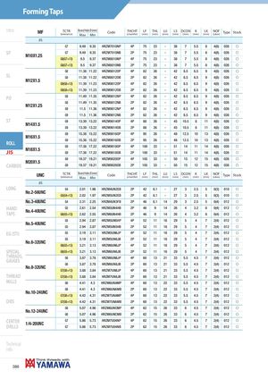 Forming Taps Intro MF TCTR Bored Hole Ø (mm)(tolerance)MaxMinCodeTHCHT(chamfer)LF(mm)THL(mm) LU(mm) LS DCON K(mm)(mm)(mm)LK(mm)NOF(Lobes)TypeStock JIS G7 9.49 9.35 HRZM7010NP 4P 75 23 - 38 7 5.5 8 4(8) 026 f SP M10X1.25 G7 9.49 9.35 HRZM7010NB 2P 75 23 - 38 7 5.5 8 4(8) 026 f G8(G7+13) 9.5 9.37 HRZM8010NP 4P 75 23 - 38 7 5.5 8 4(8) 026 f G8(G7+13) 9.5 9.37 HRZM8010NB 2P 75 23 - 38 7 5.5 8 4(8) 026 f G8 11.38 11.22 HRZM8012OP 4P 82 26 - 42 8.5 6.5 9 4(8) 026 f SL G8 11.38 11.22 HRZM8012OB 2P 82 26 - 42 8.5 6.5 9 4(8) 026 f M12X1.5 G9(G8+13) 11.39 11.23 HRZM9012OP 4P 82 26 - 42 8.5 6.5 9 4(8) 026 f G9(G8+13) 11.39 11.23 HRZM9012OB 2P 82 26 - 42 8.5 6.5 9 4(8) 026 f PO G8 11.49 11.35 HRZM8012NP 4P 82 26 - 42 8.5 6.5 9 4(8) 026 f G8 11.49 11.35 HRZM8012NB 2P 82 26 - 42 8.5 6.5 9 4(8) 026 f M12X1.25 G9 11.5 11.36 HRZM9012NP 4P 82 26 - 42 8.5 6.5 9 4(8) 026 f G9 11.5 11.36 HRZM9012NB 2P 82 26 - 42 8.5 6.5 9 4(8) 026 f ST G9 13.39 13.22 HRZM9014OP 4P 88 26 - 45 10.5 8 11 4(8) 026 f M14X1.5 G9 13.39 13.22 HRZM9014OB 2P 88 26 - 45 10.5 8 11 4(8) 026 f G9 15.38 15.22 HRZM9016OP 4P 95 26 - 48 12.5 10 13 4(8) 026 f M16X1.5 G9 15.38 15.22 HRZM9016OB 2P 95 26 - 48 12.5 10 13 4(8) 026 f ROLL G9 17.38 17.22 HRZM9018OP 4P 100 33 - 51 14 11 14 4(8) 026 f JIS M18X1.5 G9 17.38 17.22 HRZM9018OB 2P 100 33 - 51 14 11 14 4(8) 026 f G9 19.37 19.21 HRZM9020OP 4P 105 33 - 50 15 12 15 4(8) 026 f M20X1.5 CARBIDE G9 19.37 19.21 HRZM9020OB 2P 105 33 - 50 15 12 15 4(8) 026 f UNC TCTR Bored Hole Ø (mm)(tolerance)MaxMinCodeTHCHT(chamfer)LF(mm)THL(mm) LU(mm) LS DCON K(mm)(mm)(mm)LK(mm)NOF(Lobes)TypeStock JIS LONG G4 2.01 1.96 HRZM4UN2EB 2P 42 8.1 - 27 3 2.5 5 0(3) 010 f No.2-56UNC G5(G4+13) 2.02 1.97 HRZM5UN2EB 2P 42 8.1 - 27 3 2.5 5 0(3) 010 f No.3-48UNC G4 2.31 2.25 HRZM4UN3FB 2P 46 8.1 14 29 3 2.5 5 0(4) 012 f HANDTAPS No.4-40UNC G5 2.61 2.54 HRZM5UN4HB 2P 46 9 14 26 4 3.2 6 0(4) 012 fG6(G5+13)2.622.55HRZM6UN4HB2P469142643.260(4)012f G5 2.94 2.87 HRZM5UN5HP 4P 52 11 16 29 5 4 7 2(4) 012 f No.5-40UNC G5 2.94 2.87 HRZM5UN5HB 2P 52 11 16 29 5 4 7 2(4) 012 f EG (STI) G5 3.19 3.11 HRZM5UN6JP 4P 52 11 16 29 5 4 7 2(4) 012 f G5 3.19 3.11 HRZM5UN6JB 2P 52 11 16 29 5 4 7 2(4) 012 f No.6-32UNC G6(G5+13) 3.21 3.13 HRZM6UN6JP 4P 52 11 16 29 5 4 7 2(4) 012 f SPECIAL G6(G5+13) 3.21 3.13 HRZM6UN6JB 2P 52 11 16 29 5 4 7 2(4) 012 f THREADS,GAUGES G6 3.87 3.78 HRZM6UN8JP 4P 60 13 21 33 5.5 4.5 7 2(4) 012 f G6 3.87 3.78 HRZM6UN8JB 2P 60 13 21 33 5.5 4.5 7 2(4) 012 f No.8-32UNC G7(G6+13) 3.88 3.84 HRZM7UN8JP 4P 60 13 21 33 5.5 4.5 7 2(4) 012 f THREAD G7(G6+13) 3.88 3.84 HRZM7UN8JB 2P 60 13 21 33 5.5 4.5 7 2(4) 012 f MILLS G6 4.41 4.3 HRZM6UNAMP 4P 60 13 22 33 5.5 4.5 7 2(4) 012 f G6 4.41 4.3 HRZM6UNAMB 2P 60 13 22 33 5.5 4.5 7 2(4) 012 f No.10-24UNC G7(G6+13) 4.42 4.31 HRZM7UNAMP 4P 60 13 22 33 5.5 4.5 7 2(4) 012 f DIES G7(G6+13) 4.42 4.31 HRZM7UNAMB 2P 60 13 22 33 5.5 4.5 7 2(4) 012 f G6 5.07 4.96 HRZM6UNCMP 4P 62 15 26 33 6 4.5 7 2(4) 012 f No.12-24UNC G6 5.07 4.96 HRZM6UNCMB 2P 62 15 26 33 6 4.5 7 2(4) 012 f CENTERDRILLS1/4-20UNC G7 5.86 5.73 HRZM7U04NP 4P 62 15 26 33 6 4.5 7 2(4) 012 fG75.865.73HRZM7U04NB2P6215263364.572(4)012f Technical info 386