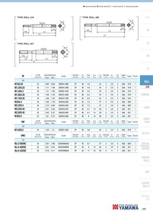 h stock standard, ) check stock EU, f check stock JP, m stock exhaustion TYPE: ROLL_019 TYPE: ROLL_020 Intro DCON K KDCON LK KTHLLS THL LK KLS SP LF LF TYPE: ROLL_021 SL DCON K THL LK K PO LU LS LF ST M TCTR Bored Hole Ø (mm)(tolerance)MaxMinCodeTHCHT(chamfer)LF(mm)THL(mm) LU(mm) LS DCON K(mm)(mm)(mm)LK(mm)NOF(Lobes)TypeStock JIS ROLL M1X0.25 G4 0.92 0.89 SURZ41.0BB 2P 36 4.5 - 24 3 2.5 5 0(4) 019 f M1.2X0.25 G4 1.11 1.09 SURZ41.2BB 2P 36 4.5 - 24 3 2.5 5 0(4) 019 f JIS M1.4X0.3 G4 1.3 1.26 SURZ41.4CB 2P 36 5.4 - 24 3 2.5 5 0(4) 019 f M1.6X0.35 G4 1.46 1.43 SURZ41.6DB 2P 36 6.3 - 24 3 2.5 5 0(4) 019 f CARBIDE M1.7X0.35 G4 1.56 1.52 SURZ41.7DB 2P 36 6.3 - 24 3 2.5 5 0(4) 019 f M2X0.4 G4 1.83 1.79 SURZ42.0EB 2P 42 7.2 - 27 3 2.5 5 0(4) 020 f M2.3X0.4M2.5X0.45 G4 2.13 2.09 SURZ42.3EB 2P 42 7.2 - 27 3 2.5 5 0(4) 020 fG42.312.26SURZ42.5FB2P468.1142932.550(4)021fLONG M2.6X0.45 G5 2.42 2.37 SURZ52.6FB 2P 46 8.1 14 29 3 2.5 5 0(4) 021 f M3X0.5 G5 2.8 2.75 SURZ53.0GB 2P 46 9 14 26 4 3.2 6 2(4) 021 f HAND MF TCTR Bored Hole Ø (mm)(tolerance)MaxMinCodeTHCHT(chamfer)LF(mm)THL(mm) LU(mm) LS DCON K(mm)(mm)(mm)LK(mm)NOF(Lobes)TypeStock TAPS JIS M1.6X0.2 G3 1.53 1.5 SURZ31.6AB 2P 36 3.6 - 24 3 2.5 5 0(4) 019 f UNC TCTR Bored Hole Ø (mm)(tolerance)MaxMinCode EG (STI)THCHT(chamfer)LF(mm)THL(mm)LU(mm)LSDCONK(mm)(mm)(mm)LK(mm)NOF(Lobes)TypeStock JIS No.2-56UNC G4 2.01 1.96 SURZ4UN2EB 2P 42 8.1 - 27 3 2.5 5 0(3) 020 f SPECIAL No.4-40UNC G5 2.61 2.54 SURZ5UN4HB 2P 46 9 14 26 4 3.2 6 0(4) 021 f THREADS,GAUGES No.6-32UNC G5 3.19 3.11 SURZ5UN6JB 2P 52 11 16 29 5 4 7 2(4) 021 f THREAD MILLS DIES CENTER DRILLS Technical info 389
