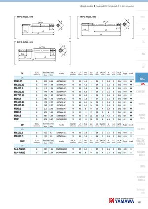 h stock standard, ) check stock EU, f check stock JP, m stock exhaustion TYPE: ROLL_019 TYPE: ROLL_020 Intro DCON K KDCON LK KTHLLS THL LK KLS SP LF LF TYPE: ROLL_021 SL DCON K THL LK K PO LU LS LF ST M TCTR Bored Hole Ø (mm)(tolerance)MaxMinCodeTHCHT(chamfer)LF(mm)THL(mm) LU(mm) LS DCON K(mm)(mm)(mm)LK(mm)NOF(Lobes)TypeStock JIS ROLL M1X0.25 G4 0.92 0.89 SRZM41.0B1 1P 36 4.5 - 24 3 2.5 5 0(4) 019 ) M1.2X0.25 G4 1.11 1.09 SRZM41.2B1 1P 36 4.5 - 24 3 2.5 5 0(4) 019 ) JIS M1.4X0.3 G4 1.3 1.26 SRZM41.4C1 1P 36 5.4 - 24 3 2.5 5 0(4) 019 ) M1.6X0.35 G4 1.46 1.43 SRZM41.6D1 1P 36 6.3 - 24 3 2.5 5 0(4) 019 ) CARBIDE M1.7X0.35 G4 1.56 1.52 SRZM41.7D1 1P 36 6.3 - 24 3 2.5 5 0(4) 019 f M2X0.4 G4 1.83 1.79 SRZM42.0E1 1P 42 7.2 - 27 3 2.5 5 0(4) 020 ) M2.5X0.45M2.6X0.45 G5 2.32 2.27 SRZM52.5F1 1P 46 8.1 14 29 3 2.5 5 0(4) 021 )G52.422.37SRZM52.6F11P468.1142932.550(4)021fLONG M3X0.5 G5 2.8 2.75 SRZM53.0G1 1P 46 9 14 26 4 3.2 6 2(4) 021 ) M4X0.7 G6 3.72 3.65 SRZM64.0I1 1P 52 11 17 29 5 4 7 2(4) 021 ) M5X0.8 G6 4.67 4.59 SRZM65.0K1 1P 60 13 22 33 5.5 4.5 7 2(4) 021 ) HAND M6X1 G6 5.58 5.47 SRZM66.0M1 1P 62 15 26 33 6 4.5 7 2(4) 021 ) TAPS MF TCTR Bored Hole Ø (mm)(tolerance)MaxMinCodeTHCHT(chamfer)LF(mm)THL(mm) LU(mm) LS DCON K(mm)(mm)(mm)LK(mm)NOF(Lobes)TypeStock JIS EG (STI) M1.4X0.2 G3 1.33 1.3 SRZM31.4A1 1P 36 3.6 - 24 3 2.5 5 0(4) 019 f M1.6X0.2 G3 1.53 1.5 SRZM31.6A1 1P 36 3.6 - 24 3 2.5 5 0(4) 019 f SPECIAL UNC TCTR Bored Hole Ø (mm)(tolerance)MaxMinCodeTHCHT(chamfer)LF(mm)THL(mm) LU(mm) LS DCON K(mm)(mm)(mm)LK(mm)NOF(Lobes)TypeStockTHREADS,GAUGES JIS No.2-56UNC G4 2.01 1.96 SRZM4UN2E1 1P 42 8.1 - 27 3 2.5 5 0(3) 020 f No.4-40UNC G5 2.61 2.54 SRZM5UN4H1 1P 46 9 14 25 4 3.2 6 0(4) 021 f THREAD MILLS DIES CENTER DRILLS Technical info 391
