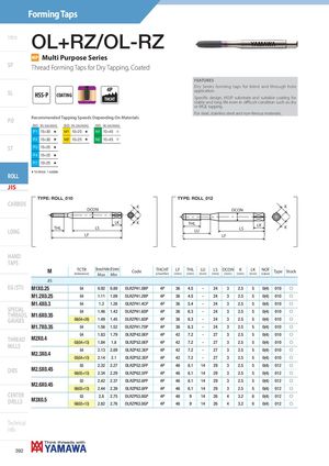 Forming Taps Intro OL+RZ/OL-RZ MP Multi Purpose Series SP Thread Forming Taps for Dry Tapping, Coated FEATURES SL HSS-P COATING 4PTHCHT Dry Series forming taps for blind and through holeapplication.Specific design, HSSP substrate and suitable coating forstable and long life even in difficult condition such as dry or MQL tapping. For steel, stainless steel and non-ferrous materials. PO Recommended Tapping Speeds Depending On Materials ISO Vc (m/min) ISO Vc (m/min) ISO Vc (m/min) P1 15÷30 H M1 10÷25 H N1 10÷45 I P2 15÷30 H M2 10÷25 H N2 10÷45 I ST P3 15÷25 H P4 15÷25 H P7 10÷25 H H 1st choice I suitable ROLL JIS JIS-OL+RZ/OL-RZ TYPE: ROLL_010 TYPE: ROLL_012 CARBIDE DCON K KDCON LK KLONGTHLLSLF THL LU LKLS KLF HAND TAPS M TCTR Bored Hole Ø (mm)(tolerance)MaxMinCodeTHCHT(chamfer)LF(mm)THL(mm) LU(mm) LS DCON K(mm)(mm)(mm)LK(mm)NOF(Lobes)TypeStock JIS EG (STI) M1X0.25 G4 0.92 0.89 OLRZP41.0BP 4P 36 4.5 - 24 3 2.5 5 0(4) 010 f M1.2X0.25 G4 1.11 1.09 OLRZP41.2BP 4P 36 4.5 - 24 3 2.5 5 0(4) 010 f M1.4X0.3 G4 1.3 1.26 OLRZP41.4CP 4P 36 5.4 - 24 3 2.5 5 0(4) 010 f SPECIALTHREADS,M1.6X0.35 G4 1.46 1.43 OLRZP41.6DP 4P 36 6.3 - 24 3 2.5 5 0(4) 010 f GAUGES G6(G4+26) 1.49 1.45 OLRZP61.6DP 4P 36 6.3 - 24 3 2.5 5 0(4) 010 f M1.7X0.35 G4 1.56 1.52 OLRZP41.7DP 4P 36 6.3 - 24 3 2.5 5 0(4) 010 f G4 1.83 1.79 OLRZP42.0EP 4P 42 7.2 - 27 3 2.5 5 0(4) 010 f THREAD M2X0.4MILLS G5(G4+13) 1.84 1.8 OLRZP52.0EP 4P 42 7.2 - 27 3 2.5 5 0(4) 010 fG42.132.09OLRZP42.3EP4P427.2-2732.550(4)010f M2.3X0.4 G5(G4+13) 2.14 2.1 OLRZP52.3EP 4P 42 7.2 - 27 3 2.5 5 0(4) 010 f G5 2.32 2.27 OLRZP52.5FP 4P 46 8.1 14 29 3 2.5 5 0(4) 012 f DIES M2.5X0.45 G6(G5+13) 2.34 2.29 OLRZP62.5FP 4P 46 8.1 14 29 3 2.5 5 0(4) 012 f G5 2.42 2.37 OLRZP52.6FP 4P 46 8.1 14 29 3 2.5 5 0(4) 012 f M2.6X0.45 G6(G5+13) 2.44 2.39 OLRZP62.6FP 4P 46 8.1 14 29 3 2.5 5 0(4) 012 f CENTER G5 2.8 2.75 OLRZP53.0GP 4P 46 9 14 26 4 3.2 6 0(4) 012 f DRILLS M3X0.5 G6(G5+13) 2.82 2.76 OLRZP63.0GP 4P 46 9 14 26 4 3.2 6 0(4) 012 f Technical info 392
