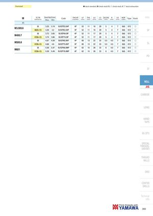Oversized h stock standard, ) check stock EU, f check stock JP, m stock exhaustion M TCTR Bored Hole Ø (mm)(tolerance)MaxMinCodeTHCHT(chamfer)LF(mm)THL(mm) LU(mm) LS DCON K(mm)(mm)(mm)LK(mm)NOF(Lobes)TypeStock Intro JIS G5 3.25 3.19 OLRZP53.5HP 4P 52 11 16 29 5 4 7 0(4) 012 f M3.5X0.6 G6(G5+13) 3.26 3.2 OLRZP63.5HP 4P 52 11 16 29 5 4 7 0(4) 012 f SP G6 3.72 3.65 OLRZP64.0IP 4P 52 11 17 29 5 4 7 0(4) 012 f M4X0.7 G7(G6+13) 3.74 3.66 OLRZP74.0IP 4P 52 11 17 29 5 4 7 0(4) 012 f G6 4.67 4.59 OLRZP65.0KP 4P 60 13 22 33 5.5 4.5 7 0(4) 012 f M5X0.8 G7(G6+13) 4.68 4.6 OLRZP75.0KP 4P 60 13 22 33 5.5 4.5 7 0(4) 012 f SL G6 5.58 5.47 OLRZP66.0MP 4P 62 15 26 33 6 4.5 7 0(4) 012 f M6X1 G7(G6+13) 5.59 5.49 OLRZP76.0MP 4P 62 15 26 33 6 4.5 7 0(4) 012 f PO ST ROLL JIS CARBIDE LONG HAND TAPS EG (STI) SPECIAL THREADS, GAUGES THREAD MILLS DIES CENTER DRILLS Technical info 393