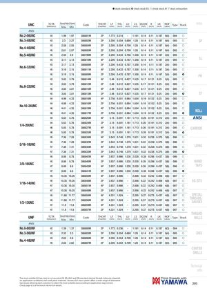 h stock standard, ) check stock EU, f check stock JP, m stock exhaustion UNC TCTR Bored Hole Ø (mm)(tolerance)MaxMinCode THCHT (chamfer) LF(inch) THL(inch) LU(inch) LS DCON K(inch)(inch)(inch)LK(inch)NOF(Lobes)TypeStockIntro ANSI No.2-56UNC H3 1.99 1.97 386801M 2P 1.772 0.314 - 1.161 0.14 0.11 0.187 0(4) 004 f No.3-48UNC H3 2.3 2.27 386802M 2P 2.205 0.354 0.669 1.28 0.14 0.11 0.187 0(4) 005 f SP H3 2.58 2.55 386804M 2P 2.205 0.354 0.709 1.28 0.14 0.11 0.187 0(4) 005 f No.4-40UNC H5 2.61 2.57 386805M 2P 2.205 0.354 0.709 1.28 0.14 0.11 0.187 0(4) 005 f No.5-40UNC H5 2.94 2.9 386799M 2P 2.205 0.433 0.768 1.358 0.14 0.11 0.187 2(4) 005 f H3 3.17 3.13 386810M 4P 2.205 0.433 0.787 1.358 0.14 0.11 0.187 2(4) 005 f SL H3 3.17 3.13 386808M 2P 2.205 0.433 0.787 1.358 0.14 0.11 0.187 2(4) 005 f No.6-32UNC H5 3.19 3.15 386811M 4P 2.205 0.433 0.787 1.358 0.14 0.11 0.187 2(4) 005 f H5 3.19 3.15 386809M 2P 2.205 0.433 0.787 1.358 0.14 0.11 0.187 2(4) 005 ) PO H3 3.83 3.79 386814M 4P 2.48 0.512 0.827 1.535 0.17 0.131 0.25 2(4) 005 f H3 3.83 3.79 386812M 2P 2.48 0.512 0.827 1.535 0.17 0.131 0.25 2(4) 005 f No.8-32UNC H5 3.85 3.81 386815M 4P 2.48 0.512 0.827 1.535 0.17 0.131 0.25 2(4) 005 f H5 3.85 3.81 386813M 2P 2.48 0.512 0.827 1.535 0.17 0.131 0.25 2(4) 005 ) ST H4 4.99 4.33 386818M 4P 2.756 0.551 0.984 1.654 0.19 0.152 0.25 2(4) 005 f H4 4.99 4.33 386816M 2P 2.756 0.551 0.984 1.654 0.19 0.152 0.25 2(4) 005 f No.10-24UNC H6 4.41 4.35 386819M 4P 2.756 0.551 0.984 1.654 0.19 0.152 0.25 2(4) 005 f H6 4.41 4.35 386817M 2P 2.756 0.551 0.984 1.654 0.19 0.152 0.25 2(4) 005 ) ROLL H4 5.83 5.76 386826M 4P 3.15 0.591 1.181 1.713 0.26 0.191 0.312 2(4) 005 f ANSI H4 5.83 5.76 386824M 2P 3.15 0.591 1.181 1.713 0.26 0.191 0.312 2(4) 005 f 1/4-20UNC H6 5.85 5.78 386827M 4P 3.15 0.591 1.181 1.713 0.26 0.191 0.312 2(4) 005 f CARBIDE H6 5.85 5.78 386825M 2P 3.15 0.591 1.181 1.713 0.26 0.191 0.312 2(4) 005 ) H5 7.36 7.28 386834M 4P 3.543 0.748 1.378 1.831 0.32 0.238 0.375 3(6) 006 f H5 7.36 7.28 386832M 2P 3.543 0.748 1.378 1.831 0.32 0.238 0.375 3(6) 006 f 5/16-18UNC H7 7.38 7.31 386835M 4P 3.543 0.748 1.378 1.831 0.32 0.238 0.375 3(6) 006 f LONG H7 7.38 7.31 386833M 2P 3.543 0.748 1.378 1.831 0.32 0.238 0.375 3(6) 006 ) H5 8.86 8.78 386842M 4P 3.937 0.906 1.535 2.028 0.38 0.286 0.437 3(6) 006 f H5 8.86 8.78 386840M 2P 3.937 0.906 1.535 2.028 0.38 0.286 0.437 3(6) 006 f HAND 3/8-16UNC H7 8.89 8.8 386843M 4P 3.937 0.906 1.535 2.028 0.38 0.286 0.437 3(6) 006 f TAPS H7 8.89 8.8 386841M 2P 3.937 0.906 1.535 2.028 0.38 0.286 0.437 3(6) 006 ) H5 10.35 10.26 386850M 4P 3.937 0.906 - 2.008 0.32 0.242 0.406 4(8) 007 f H5 10.35 10.26 386848M 2P 3.937 0.906 - 2.008 0.32 0.242 0.406 4(8) 007 f EG (STI) 7/16-14UNC H7 10.38 10.28 386851M 4P 3.937 0.906 - 2.008 0.32 0.242 0.406 4(8) 007 f H7 10.38 10.28 386849M 2P 3.937 0.906 - 2.008 0.32 0.242 0.406 4(8) 007 f H5 11.88 11.77 386858M 4P 4.331 1.024 - 2.205 0.37 0.275 0.437 4(8) 007 f SPECIAL 1/2-13UNC H5 11.88 11.77 386856M 2P 4.331 1.024 - 2.205 0.37 0.275 0.437 4(8) 007 f THREADS,GAUGES H7 11.9 11.8 386859M 4P 4.331 1.024 - 2.205 0.37 0.275 0.437 4(8) 007 f H7 11.9 11.8 386857M 2P 4.331 1.024 - 2.205 0.37 0.275 0.437 4(8) 007 f THREAD UNF TCTR Bored Hole Ø (mm)(tolerance)MaxMinCode THCHT (chamfer) LF(inch) THL(inch) LU(inch) LS DCON K(inch)(inch)(inch)LK(inch)NOF(Lobes)TypeStockMILLS ANSI No.0-80UNF H2 1.39 1.37 386800M 2P 1.772 0.236 - 1.161 0.14 0.11 0.187 0(3) 004 f No.3-56UNF H3 2.32 2.3 386803M 2P 2.205 0.354 0.669 1.28 0.14 0.11 0.187 0(4) 005 f DIES H3 2.62 2.6 386806M 2P 2.205 0.354 0.709 1.28 0.14 0.11 0.187 0(4) 005 f No.4-48UNF H5 2.65 2.62 386807M 2P 2.205 0.354 0.709 1.28 0.14 0.11 0.187 0(4) 005 f CENTER DRILLS Technical info The most suitable GH tap class to cut accurate 2B, 3B (UNJ) and 2B oversized internal threads tolerance, depends on application conditions and work-piece materials. Yamawa GH class system offers a wide range of alternative tap classes allowing each customer to select the most suitable one according to application requirement. 395 Check page 673 of Technical info for full details.