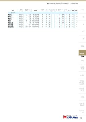 h stock standard, ) check stock EU, f check stock JP, m stock exhaustion M TCTR Ø Hole Ø(tolerance)(mm)(mm)CodeTHCHT(chamfer)LF(mm)THL(mm) LU(mm) LS DCON K(mm)(mm)(mm)LK(mm)NOFTypeStock Intro DIN 371 M3X0.5 ISO2X(6HX) 2.5 2.56 TD3.0GBLWB3 3P 56 11 - - 3.5 2.7 6 3 040 h M4X0.7 ISO2X(6HX) 3.3 3.38 TD4.0IBLWB3 3P 63 13 - - 4.5 3.4 6 3 040 h SP M5X0.8 ISO2X(6HX) 4.2 4.28 TD5.0KBLWB3 3P 70 16 - - 6 4.9 8 3 040 h M6X1 ISO2X(6HX) 5 5.09 TD6.0MBLWB3 3P 80 19 - - 6 4.9 8 3 040 h M8X1.25 ISO2X(6HX) 6.8 6.85 TD8.0KBLWB3 3P 90 22 - - 8 6.2 9 3 043 h M10X1.5 ISO2X(6HX) 8.5 8.6 TD010OBLWB3 3P 100 24 - - 10 8 11 3 043 h SL M12X1.75 ISO2X(6HX) 10.3 10.36 TG012PBLWB3 3P 110 29 - - 9 7 10 3 116 h PO ST ROLL CARBIDE DIN LONG HAND TAPS EG (STI) SPECIAL THREADS, GAUGES THREAD MILLS DIES CENTER DRILLS Technical info 403