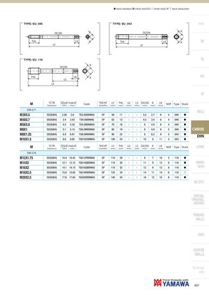 h stock standard, ) check stock EU, f check stock JP, m stock exhaustion TYPE: EU_040 TYPE: EU_043 Intro DCON DCON K THL LK THL LK K SP LF LF TYPE: EU_116 SL K DCON THL LKLS K PO LF ST M TCTR Ø Hole Ø(tolerance)(mm)(mm)CodeTHCHT(chamfer)LF(mm)THL(mm) LU(mm) LS DCON K(mm)(mm)(mm)LK(mm)NOFTypeStock DIN 371 ROLL M3X0.5 ISO2X(6HX) 2.56 2.6 TD3.0GBBWA5 5P 56 11 - - 3.5 2.7 6 4 040 h M4X0.7 ISO2X(6HX) 3.4 3.42 TD4.0IBBWA5 5P 63 13 - - 4.5 3.4 6 4 040 h M5X0.8 ISO2X(6HX) 4.3 4.33 TD5.0KBBWA5 5P 70 16 - - 6 4.9 8 4 040 h M6X1 ISO2X(6HX) 5.1 5.15 TD6.0MBBWA5 5P 80 19 - - 6 4.9 8 5 040 h CARBIDE M8X1.25 ISO2X(6HX) 6.9 6.91 TD8.0NBBWA5 5P 90 22 - - 8 6.2 9 5 043 h DIN M10X1.5 ISO2X(6HX) 8.6 8.65 TD010OBBWA5 5P 100 24 - - 10 8 11 5 043 h M TCTR Ø Hole Ø(tolerance)(mm)(mm)CodeTHCHT(chamfer)LF(mm)THL(mm) LU(mm) LS DCON K(mm)(mm)(mm)LK(mm)NOFTypeStock LONG DIN 376 M12X1.75 ISO2X(6HX) 10.4 10.42 TG012PBBWA5 5P 110 29 - - 9 7 10 5 116 h M14X2 ISO2X(6HX) 12.1 12.15 TG014QBBWA5 5P 110 30 - - 11 9 12 6 116 h HAND M16X2 ISO2X(6HX) 14.1 14.15 TG016QBBWA5 5P 110 32 - - 12 9 12 6 116 h TAPS M18X2.5 ISO2X(6HX) 15.6 15.65 TG018RBBWA5 5P 125 34 - - 14 11 14 6 116 f M20X2.5 ISO2X(6HX) 17.6 17.65 TG020RBBWA5 5P 140 34 - - 16 12 15 6 116 h EG (STI) SPECIAL THREADS, GAUGES THREAD MILLS DIES CENTER DRILLS Technical info 407
