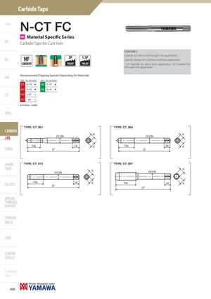 Carbide Taps Intro N-CT FC MS Material Specific Series SP Carbide Taps for Cast Iron FEATURES SL HF 3P 1.5P Carbide for blind and through hole application.Specific design for Cast Iron and Brass application. CARBIDE THCHT THCHT 1.5P chamfer for blind hole application, 3P chamfer for through hole application. PO Recommended Tapping Speeds Depending On Materials ISO Vc (m/min) ISO Vc (m/min) K1 5÷15 H N2 5÷15 H K2 5÷15 H N4 5÷15 H ST K3 ≤10 I K4 ≤8 I H 1st choice I suitable ROLL JIS-N-CT FC TYPE: CT_001 TYPE: CT_004 CARBIDE JIS DCON K DCON K LONG THL LF LK K THL LK KLF HAND TYPE: CT_015 TYPE: CT_007 TAPS DCON K KDCON EG (STI) THL LF LK K THL LK KLF SPECIAL THREADS, GAUGES THREAD MILLS DIES CENTER DRILLS Technical info 408