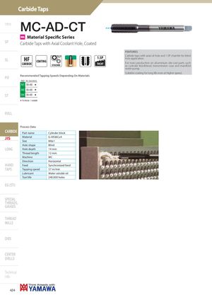 Carbide Taps Intro MC-AD-CT MS Material Specific Series SP Carbide Taps with Axial Coolant Hole, Coated FEATURES SL HF COATINGCARBIDE SYNCHRO 1.5P Carbide taps with axial oil hole and 1.5P chamfer for blindhole application.THCHTFor mass production on alluminium die-cast parts suchas cylinder blockhead, transmission case and manifold water-pump. Suitable coating for long life even at higher speed. PO Recommended Tapping Speeds Depending On Materials ISO Vc (m/min) N1 30÷60 H N2 30÷60 H ST N4 30÷60 H H 1st choice I suitable ROLL JIS-MC-AD-CT Process Data CARBIDE Part name Cylinder block JIS Material G-AlSi6Cu4 Size M6x1 Hole shape Blind LONG Hole depth 14 mm Thread length 12 mm Machine MC Direction Horizontal HAND Feed Synchronized feed TAPS Tapping speed 57 m/min Lubricant Water soluble oil Tool life 240.000 holes EG (STI) SPECIAL THREADS, GAUGES THREAD MILLS DIES CENTER DRILLS Technical info 424