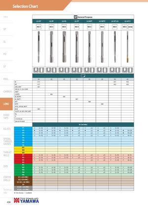 Selection Chart Intro GP General Purpose LS-HT LS-PF LS-PS LS-PT LS-NPT LS-NPTF LS-HT LH LS-HT V HSS-E HSS-E HSS-E HSS-E HSS-E HSS-E HSS-E HSS-E COATING SP SL PO ST ROLL JIS JIS JIS JIS JIS JIS JIS JIS M 473 491 495 MF 477 492 495 UNC/UNF 481 UNS, 8, 12, 20, 32UN CARBIDE UNEF G (BSP) 484 Rp (BSPP) 485 Rc (BSPT) 487 NPT 488 LONG NPTF 489 NPSC, NPSM, NPSF BSW 483 EG(STI), M, MF, UNC/UNF HAND Pg TAPS TrS miniature Special threads Vc (m/min) EG (STI) P1 I 5÷10 I 5÷10 I 5÷10 I ≤5 I ≤5 I ≤5 I 5÷10P2H5÷10H5÷10H5÷10H≤5H≤5H≤5H5÷10H10÷20 P3 I 5÷10 I 5÷10 I 5÷10 I ≤5 I ≤5 I ≤5 I 5÷10 H 10÷20 P4 I 5÷10 I 5÷10 I 5÷10 I ≤5 I ≤5 I ≤5 I 5÷10 I 8÷15 SPECIALTHREADS,GAUGES P5P6P7P8 M1 M2 THREAD M3 MILLS K1 I 5÷10 I 5÷10 I 5÷10 I ≤5 I ≤5 I ≤5 I 5÷10 I 8÷15 K2 I 5÷10 I 5÷10 I 5÷10 I ≤5 I ≤5 I ≤5 I 5÷10 I 8÷15 K3 I 5÷10 I 5÷10 I ≤5 I ≤5 I 5÷10 I 8÷15 K4 DIES N1N2 I 5÷10 I 5÷10 I 5÷10 I ≤5 I ≤5 I ≤5 I 5÷10 I 10÷20 N3 I 5÷10 I 5÷10 I 5÷10 I ≤5 I ≤5 I ≤5 I 5÷10 I 10÷20 N4 I 5÷10 I 5÷10 I 5÷10 I ≤5 I ≤5 I ≤5 I 5÷10 I 10÷20 N5 CENTER S1 (<25 HRC) DRILLS S2 (<35 HRC) S3 (35 ÷ 45 HRC) S5 H (45 ÷ 55 HRC) Technical H (55 ÷ 63 HRC) info H 1st choice I suitable 436