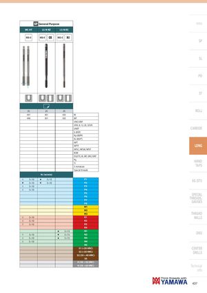 GP General Purpose Intro MC-HT LS-N-RZ LS-N-RS HSS-E HSS-E OX HSS-E NI SP SL PO ST JIS JIS JIS ROLL 497 501 503 M 498 501 503 MF UNC/UNF UNS, 8, 12, 20, 32UN UNEF CARBIDE G (BSP) Rp (BSPP) Rc (BSPT) NPT NPTF LONG NPSC, NPSM, NPSF BSW EG(STI), M, MF, UNC/UNF Pg HAND TrS miniature TAPS Special threads Vc (m/min) I 5÷10 H 5÷15 P1H5÷10H5÷10P2 EG (STI) I 5÷10 P3 I 5÷10 P4 P5P6P7P8 SPECIALTHREADS,GAUGES M1 M2 M3 THREAD I 5÷10 K1 MILLS I 5÷10 K2 I 5÷10 K3 K4 H 5÷15 N1I5÷10H5÷15N2 DIES I 5÷10 H 5÷15 N3 I 5÷10 N4 N5 S1 (<35 HRC) CENTER S2 (<35 HRC) DRILLS S3 (35 ÷ 45 HRC) S5 H (45 ÷ 55 HRC) H (55 ÷ 63 HRC) Technical info 437
