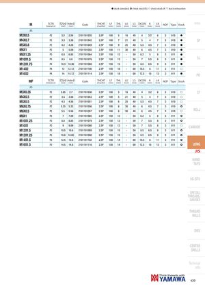 h stock standard, ) check stock EU, f check stock JP, m stock exhaustion M TCTR Ø Hole Ø(tolerance)(mm)(mm)CodeTHCHT(chamfer)LF(mm)THL(mm) LU(mm) LS DCON K(mm)(mm)(mm)LK(mm)NOFTypeStock Intro JIS M3X0.5 P2 2.5 2.56 2101101035 2.5P 100 5 18 40 4 3.2 6 3 010 h M4X0.7 P2 3.3 3.38 2101101042 2.5P 100 7 21 40 5 4 7 3 010 h SP M5X0.8 P2 4.2 4.28 2101101049 2.5P 100 9 25 40 5.5 4.5 7 3 010 h M6X1 P2 5 5.09 2101101055 2.5P 100 11 30 40 6 4.5 7 3 010 h M8X1.25 P3 6.8 6.85 2101101064 2.5P 150 12 - 50 6.2 5 8 3 011 h M10X1.5 P3 8.5 8.6 2101101078 2.5P 150 13 - 50 7 5.5 8 3 011 h SL M12X1.75 P4 10.3 10.36 2101101088 2.5P 150 15 - 50 8.5 6.5 9 3 011 h M14X2 P4 12 12.12 2101101100 2.5P 150 18 - 60 10.5 8 11 3 011 f M16X2 P4 14 14.12 2101101114 2.5P 150 18 - 60 12.5 10 13 3 011 h PO MF TCTR Ø Hole Ø(tolerance)(mm)(mm)CodeTHCHT(chamfer)LF(mm)THL(mm) LU(mm) LS DCON K(mm)(mm)(mm)LK(mm)NOFTypeStock JIS M3X0.35 P2 2.65 2.7 2101101036 2.5P 100 5 18 40 4 3.2 6 3 010 f ST M4X0.5 P2 3.5 3.56 2101101043 2.5P 100 5 21 40 5 4 7 3 010 f M5X0.5 P2 4.5 4.56 2101101051 2.5P 100 6 25 40 5.5 4.5 7 3 010 f M6X0.75 P2 5.25 5.33 2101101056 2.5P 100 8 30 40 6 4.5 7 3 010 ) M6X0.5 P2 5.5 5.56 2101101057 2.5P 100 8 30 40 6 4.5 7 3 010 f ROLL M8X1 P3 7 7.09 2101101065 2.5P 150 12 - 50 6.2 5 8 3 011 ) M10X1.25 P3 8.8 8.85 2101101079 2.5P 150 13 - 50 7 5.5 8 3 011 ) M10X1 P3 9 9.09 2101101080 2.5P 150 13 - 50 7 5.5 8 3 011 f CARBIDE M12X1.5 P3 10.5 10.6 2101101089 2.5P 150 15 - 50 8.5 6.5 9 3 011 ) M12X1.25 P3 10.8 10.85 2101101090 2.5P 150 15 - 50 8.5 6.5 9 3 011 ) M14X1.5 P3 12.5 12.6 2101101102 2.5P 150 14 - 60 10.5 8 11 3 011 ) M16X1.5 P3 14.5 14.6 2101101116 2.5P 150 14 - 60 12.5 10 13 3 011 ) LONG JIS HAND TAPS EG (STI) SPECIAL THREADS, GAUGES THREAD MILLS DIES CENTER DRILLS Technical info 439