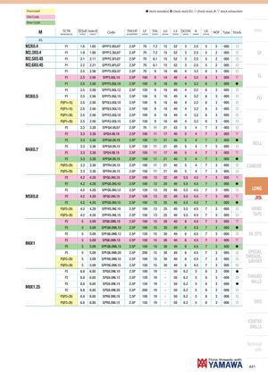 Oversized h stock standard, ) check stock EU, f check stock JP, m stock exhaustion Old Code New Code M TCTR Ø Hole Ø(tolerance)(mm)(mm)CodeTHCHT(chamfer)LF(mm)THL(mm) LU(mm) LS DCON K(mm)(mm)(mm)LK(mm)NOFTypeStock Intro JIS M2X0.4 P1 1.6 1.65 SPFP2.0EL07 2.5P 70 7.2 15 52 3 2.5 5 2 005 f M2.3X0.4 P1 1.9 1.95 SPFP2.3EL07 2.5P 70 7.2 15 52 3 2.5 5 2 005 f SP M2.5X0.45 P1 2.1 2.11 SPFP2.5FL07 2.5P 70 8.1 15 52 3 2.5 5 2 005 f M2.6X0.45 P1 2.2 2.21 SPFP2.6FL07 2.5P 70 8.1 15 52 3 2.5 5 2 005 f P1 2.5 2.56 SPFP3.0GL07 2.5P 70 9 18 46 4 3.2 6 3 005 f P1 2.5 2.56 SPP3.0GL10 2.5P 100 9 14 40 4 3.2 6 3 005 m SL P1 2.5 2.56 SPFP3.0GL10 2.5P 100 9 18 40 4 3.2 6 3 005 h P1 2.5 2.56 SPFP3.0GL12 2.5P 120 9 18 40 4 3.2 6 3 005 f M3X0.5 P1 2.5 2.56 SPFP3.0GL15 2.5P 150 9 18 40 4 3.2 6 3 005 f PO P2(P1+15) 2.5 2.56 SPFQ3.0GL10 2.5P 100 9 18 40 4 3.2 6 3 005 f P2(P1+15) 2.5 2.56 SPFQ3.0GL15 2.5P 150 9 18 40 4 3.2 6 3 005 f P3(P1+30) 2.5 2.56 SPFR3.0GL10 2.5P 100 9 18 40 4 3.2 6 3 005 f P3(P1+30) 2.5 2.56 SPFR3.0GL15 2.5P 150 9 18 40 4 3.2 6 3 005 f ST P2 3.3 3.38 SPFQ4.0IL07 2.5P 70 11 21 43 5 4 7 3 005 f P2 3.3 3.38 SPQ4.0IL10 2.5P 100 11 17 40 5 4 7 3 005 m P2 3.3 3.38 SPFQ4.0IL10 2.5P 100 11 21 40 5 4 7 3 005 h P2 3.3 3.38 SPFQ4.0IL12 2.5P 120 11 21 40 5 4 7 3 005 f ROLL M4X0.7 P2 3.3 3.38 SPQ4.0IL15 2.5P 150 11 17 40 5 4 7 3 005 m P2 3.3 3.38 SPFQ4.0IL15 2.5P 150 11 21 40 5 4 7 3 005 h P3(P2+20) 3.3 3.38 SPFR4.0IL10 2.5P 100 11 21 40 5 4 7 3 005 f CARBIDE P3(P2+20) 3.3 3.38 SPFR4.0IL15 2.5P 150 11 21 40 5 4 7 3 005 f P2 4.2 4.28 SPQ5.0KL10 2.5P 100 13 22 40 5.5 4.5 7 3 005 m P2 4.2 4.28 SPFQ5.0KL10 2.5P 100 13 25 40 5.5 4.5 7 3 005 h P2 4.2 4.28 SPFQ5.0KL12 2.5P 120 13 25 40 5.5 4.5 7 3 005 f LONG M5X0.8 P2 4.2 4.28 SPQ5.0KL15 2.5P 150 13 22 40 5.5 4.5 7 3 005 m JIS P2 4.2 4.28 SPFQ5.0KL15 2.5P 150 13 25 40 5.5 4.5 7 3 005 h P3(P2+20) 4.2 4.28 SPFR5.0KL10 2.5P 100 13 25 40 5.5 4.5 7 3 005 f HAND P3(P2+20) 4.2 4.28 SPFR5.0KL15 2.5P 150 13 25 40 5.5 4.5 7 3 005 f TAPS P2 5 5.09 SPQ6.0ML10 2.5P 100 15 26 40 6 4.5 7 3 005 m P2 5 5.09 SPFQ6.0ML10 2.5P 100 15 30 40 6 4.5 7 3 005 h P2 5 5.09 SPFQ6.0ML12 2.5P 120 15 30 40 6 4.5 7 3 005 f EG (STI) P2 5 5.09 SPQ6.0ML15 2.5P 150 15 26 40 6 4.5 7 3 005 m M6X1 P2 5 5.09 SPFQ6.0ML15 2.5P 150 15 30 40 6 4.5 7 3 005 h P2 5 5.09 SPFQ6.0ML20 2.5P 200 15 30 40 6 4.5 7 3 005 f SPECIAL P3(P2+20) 5 5.09 SPFR6.0ML10 2.5P 100 15 30 40 6 4.5 7 3 005 f THREADS,GAUGES P3(P2+20) 5 5.09 SPFR6.0ML15 2.5P 150 15 30 40 6 4.5 7 3 005 f P2 6.8 6.85 SPQ8.0NL10 2.5P 100 19 - 50 6.2 5 8 3 008 h P2 6.8 6.85 SPQ8.0NL12 2.5P 120 19 - 50 6.2 5 8 3 008 f THREAD P2 6.8 6.85 SPQ8.0NL15 2.5P 150 19 - 50 6.2 5 8 3 008 h MILLS M8X1.25 P2 6.8 6.85 SPQ8.0NL20 2.5P 200 19 - 50 6.2 5 8 3 008 f P3(P2+20) 6.8 6.85 SPR8.0NL10 2.5P 100 19 - 50 6.2 5 8 3 008 f P3(P2+20) 6.8 6.85 SPR8.0NL15 2.5P 150 19 - 50 6.2 5 8 3 008 f DIES CENTER DRILLS Technical info 441