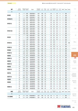 Oversized h stock standard, ) check stock EU, f check stock JP, m stock exhaustion MF TCTR Ø Hole Ø(tolerance)(mm)(mm)CodeTHCHT(chamfer)LF(mm)THL(mm) LU(mm) LS DCON K(mm)(mm)(mm)LK(mm)NOFTypeStock Intro JIS P2 9 9.09 SPQ010ML10 2.5P 100 23 - 50 7 5.5 8 3 008 f M10X1 P2 9 9.09 SPQ010ML15 2.5P 150 23 - 50 7 5.5 8 3 008 f SP P2 9 9.09 SPQ010ML12 2.5P 120 23 - 50 7 5.5 8 3 008 f M10X0.75 P2 9.3 9.33 SPQ010JL15 2.5P 150 13 - 50 7 5.5 8 3 008 f P2 10.5 10.6 SPQ012OL10 2.5P 100 26 - 50 8.5 6.5 9 3 008 f P2 10.5 10.6 SPQ012OL15 2.5P 150 26 - 50 8.5 6.5 9 3 008 f SL M12X1.5 P2 10.5 10.6 SPQ012OL20 2.5P 200 26 - 50 8.5 6.5 9 3 008 f P2 10.5 10.6 SPQ012OL12 2.5P 120 26 - 50 8.5 6.5 9 3 008 f P2 10.8 10.85 SPQ012NL10 2.5P 100 26 - 50 8.5 6.5 9 3 008 f PO P2 10.8 10.85 SPQ012NL12 2.5P 120 26 - 50 8.5 6.5 9 3 008 f M12X1.25 P2 10.8 10.85 SPQ012NL15 2.5P 150 26 - 50 8.5 6.5 9 3 008 f P2 10.8 10.85 SPQ012NL20 2.5P 200 26 - 50 8.5 6.5 9 3 008 f P2 11 11.09 SPQ012ML12 2.5P 120 26 - 50 8.5 6.5 9 3 008 f ST M12X1 P2 11 11.09 SPQ012ML15 2.5P 150 26 - 50 8.5 6.5 9 3 008 f P2 11 11.09 SPQ012ML10 2.5P 100 26 - 50 8.5 6.5 9 3 008 f P2 12.5 12.6 SPQ014OL12 2.5P 120 26 - 60 10.5 8 11 3 008 f M14X1.5 P2 12.5 12.6 SPQ014OL15 2.5P 150 26 - 60 10.5 8 11 3 008 h ROLL P2 12.5 12.6 SPQ014OL20 2.5P 200 26 - 60 10.5 8 11 3 008 f P2 14.5 14.6 SPQ016OL15 2.5P 150 26 - 60 12.5 10 13 3 008 f M16X1.5 P2 14.5 14.6 SPQ016OL20 2.5P 200 26 - 60 12.5 10 13 3 008 f CARBIDE M18X2 P3 16 16.12 SPR018QL20 2.5P 200 33 - 70 14 11 14 4 008 f P2 16.5 16.6 SPQ018OL15 2.5P 150 33 - 70 14 11 14 4 008 f M18X1.5 P2 16.5 16.6 SPQ018OL20 2.5P 200 33 - 70 14 11 14 4 008 f M20X2 P3 18 18.12 SPR020QL20 2.5P 200 33 - 70 15 12 15 4 008 f LONG M20X1.5 P3 18.5 18.6 SPR020OL15 2.5P 150 33 - 70 15 12 15 4 008 f JIS P3 18.5 18.6 SPR020OL20 2.5P 200 33 - 70 15 12 15 4 008 f M22X2 P3 20 20.12 SPR022QL20 2.5P 200 33 - 70 17 13 16 4 008 f HAND P3 20.5 20.6 SPR022OL15 2.5P 150 33 - 70 17 13 16 4 008 f TAPS M22X1.5 P3 20.5 20.6 SPR022OL20 2.5P 200 33 - 70 17 13 16 4 008 f M24X2 P3 22 22.12 SPR024QL20 2.5P 200 39 - 80 19 15 18 4 008 f P3 22.5 22.6 SPR024OL15 2.5P 150 39 - 80 19 15 18 4 008 f EG (STI) M24X1.5 P3 22.5 22.6 SPR024OL20 2.5P 200 39 - 80 19 15 18 4 008 f P3 25 25.12 SPR027QL20 2.5P 200 39 - 80 20 15 18 4 008 f M27X2 P3 25 25.12 SPR027QL25 2.5P 250 39 - 80 20 15 18 4 008 f SPECIAL M27X1.5 P3 25.5 25.6 SPR027OL20 2.5P 200 39 - 80 20 15 18 4 008 f THREADS,GAUGES P3 25.5 25.6 SPR027OL25 2.5P 250 39 - 80 20 15 18 4 008 f M30X3 P3 27 27.13 SPR030SL25 2.5P 250 46 - 80 23 17 20 4 008 f P3 28 28.12 SPR030QL20 2.5P 200 46 - 80 23 17 20 4 008 f THREAD M30X2 P3 28 28.12 SPR030QL25 2.5P 250 46 - 80 23 17 20 4 008 f MILLS P3 28.5 28.6 SPR030OL20 2.5P 200 46 - 80 23 17 20 4 008 f M30X1.5 P3 28.5 28.6 SPR030OL25 2.5P 250 46 - 80 23 17 20 4 008 f P3 28.5 28.6 SPR030OL30 2.5P 300 46 - 80 23 17 20 4 008 f DIES UNC TCTR Ø Hole Ø(tolerance)(mm)(mm)CodeTHCHT(chamfer)LF(mm)THL(mm) LU(mm) LS DCON K(mm)(mm)(mm)LK(mm)NOFTypeStock JIS CENTER 1/4-20UNC P2 5.1 5.19 SPFQU04NL10 2.5P 100 15 30 40 6 4.5 7 3 005 f DRILLS P2 5.1 5.19 SPFQU04NL15 2.5P 150 15 30 40 6 4.5 7 3 005 f Technical info 443
