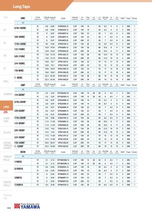 Long Taps Intro UNC TCTR Ø Hole Ø(tolerance)(mm)(mm)CodeTHCHT(chamfer)LF(mm)THL(mm) LU(mm) LS DCON K(mm)(mm)(mm)LK(mm)NOFTypeStock JIS P2 6.6 6.65 SPQU05OL10 2.5P 100 19 - 50 6.2 5 8 3 008 f 5/16-18UNC SP P2 6.6 6.65 SPQU05OL15 2.5P 150 19 - 50 6.2 5 8 3 008 f P2 8 8.07 SPQU06PL10 2.5P 100 23 - 50 7 5.5 8 3 008 f 3/8-16UNC P2 8 8.07 SPQU06PL15 2.5P 150 23 - 50 7 5.5 8 3 008 f P2 8 8.07 SPQU06PL20 2.5P 200 23 - 50 7 5.5 8 3 008 f SL 7/16-14UNC P3 9.4 9.45 SPRU07QL15 2.5P 150 26 - 50 8.5 6.5 9 3 008 f P3 10.9 10.91 SPRU08RL15 2.5P 150 26 - 60 10.5 8 11 3 008 f 1/2-13UNC P3 10.9 10.91 SPRU08RL20 2.5P 200 26 - 60 10.5 8 11 3 008 f PO 5/8-11UNC P3 13.6 13.75 SPRU10UL15 2.5P 150 26 - 60 12.5 10 13 3 008 f P3 13.6 13.75 SPRU10UL20 2.5P 200 26 - 60 12.5 10 13 3 008 f P3 16.6 16.7 SPRU12VL15 2.5P 150 33 - 70 15 12 15 4 008 f 3/4-10UNC P3 16.6 16.7 SPRU12VL20 2.5P 200 33 - 70 15 12 15 4 008 f ST P3 19.6 19.61 SPRU14WL15 2.5P 150 33 - 70 17 13 16 4 008 f 7/8-9UNC P3 19.6 19.61 SPRU14WL20 2.5P 200 33 - 70 17 13 16 4 008 f P3 22.3 22.45 SPRU16XL15 2.5P 150 39 - 80 19 15 18 4 008 f 1 -8UNC P3 22.3 22.45 SPRU16XL20 2.5P 200 39 - 80 19 15 18 4 008 f ROLL UNF TCTR Ø Hole Ø(tolerance)(mm)(mm)CodeTHCHT(chamfer)LF(mm)THL(mm) LU(mm) LS DCON K(mm)(mm)(mm)LK(mm)NOFTypeStock JIS CARBIDE 1/4-28UNF P2 5.5 5.53 SPFQU04KL10 2.5P 100 15 30 40 6 4.5 7 3 005 f P2 5.5 5.53 SPFQU04KL15 2.5P 150 15 30 40 6 4.5 7 3 005 f P2 6.9 6.97 SPQU05ML10 2.5P 100 19 - 50 6.2 5 8 3 008 f 5/16-24UNF P2 6.9 6.97 SPQU05ML15 2.5P 150 19 - 50 6.2 5 8 3 008 f LONG P2 8.5 8.57 SPQU06ML10 2.5P 100 23 - 50 7 5.5 8 3 008 f JIS 3/8-24UNF P2 8.5 8.57 SPQU06ML15 2.5P 150 23 - 50 7 5.5 8 3 008 f P2 8.5 8.57 SPQU06ML20 2.5P 200 23 - 50 7 5.5 8 3 008 f HAND 7/16-20UNF P2 9.9 9.96 SPQU07NL15 2.5P 150 26 - 50 8.5 6.5 9 3 008 f TAPS P2 11.5 11.54 SPQU08NL15 2.5P 150 26 - 60 10.5 8 11 3 008 f 1/2-20UNF P2 11.5 11.54 SPQU08NL20 2.5P 200 26 - 60 10.5 8 11 3 008 f P2 14.5 14.6 SPQU10OL15 2.5P 150 26 - 60 12.5 10 13 3 008 f 5/8-18UNF EG (STI) P2 14.5 14.6 SPQU10OL20 2.5P 200 26 - 60 12.5 10 13 3 008 f P3 17.5 17.59 SPRU12PL15 2.5P 150 33 - 70 15 12 15 4 008 f 3/4-16UNF P3 17.5 17.59 SPRU12PL20 2.5P 200 33 - 70 15 12 15 4 008 f SPECIAL 7/8-14UNF P3 20.5 20.57 SPRU14QL20 2.5P 200 33 - 70 17 13 16 4 008 f THREADS,GAUGES1 -12UNF P3 23.3 23.46 SPRU16SL20 2.5P 200 39 - 80 19 15 18 4 008 f BSW TCTR Ø Hole Ø(tolerance)(mm)(mm)CodeTHCHT(chamfer)LF(mm)THL(mm) LU(mm) LS DCON K(mm)(mm)(mm)LK(mm)NOFTypeStock THREAD JIS MILLS P2 5.1 5.13 SPFQW04NL10 2.5P 100 15 30 40 6 4.5 7 3 005 f 1/4W20 P2 5.1 5.13 SPFQW04NL15 2.5P 150 15 30 40 6 4.5 7 3 005 f P2 6.5 6.59 SPQW05OL15 2.5P 150 19 - 50 6.2 5 8 3 008 f 5/16W18 DIES P2 6.5 6.59 SPQW05OL10 2.5P 100 19 - 50 6.2 5 8 3 008 f P2 8 8.02 SPQW06PL10 2.5P 100 23 - 50 7 5.5 8 3 008 f 3/8W16 P2 8 8.02 SPQW06PL15 2.5P 150 23 - 50 7 5.5 8 3 008 f CENTER P2 8 8.02 SPQW06PL20 2.5P 200 23 - 50 7 5.5 8 3 008 f DRILLS 7/16W14 P3 9.3 9.39 SPRW07QL15 2.5P 150 26 - 50 8.5 6.5 9 3 008 f Technical info 444