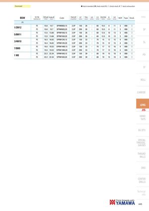 Oversized h stock standard, ) check stock EU, f check stock JP, m stock exhaustion BSW TCTR Ø Hole Ø(tolerance)(mm)(mm)CodeTHCHT(chamfer)LF(mm)THL(mm) LU(mm) LS DCON K(mm)(mm)(mm)LK(mm)NOFTypeStock Intro JIS P3 10.6 10.7 SPRW08SL15 2.5P 150 26 - 60 10.5 8 11 3 008 f 1/2W12 P3 10.6 10.7 SPRW08SL20 2.5P 200 26 - 60 10.5 8 11 3 008 f SP P3 13.5 13.68 SPRW10UL15 2.5P 150 26 - 60 12.5 10 13 3 008 f 5/8W11 P3 13.5 13.68 SPRW10UL20 2.5P 200 26 - 60 12.5 10 13 3 008 f P3 16.5 16.63 SPRW12VL15 2.5P 150 33 - 70 15 12 15 4 008 f 3/4W10 P3 16.5 16.63 SPRW12VL20 2.5P 200 33 - 70 15 12 15 4 008 f SL P3 19.5 19.53 SPRW14WL15 2.5P 150 33 - 70 17 13 16 4 008 f 7/8W9 P3 19.5 19.53 SPRW14WL20 2.5P 200 33 - 70 17 13 16 4 008 f 1 W8 P3 22.2 22.34 SPRW16XL15 2.5P 150 39 - 80 19 15 18 4 008 f PO P3 22.2 22.34 SPRW16XL20 2.5P 200 39 - 80 19 15 18 4 008 f ST ROLL CARBIDE LONG JIS HAND TAPS EG (STI) SPECIAL THREADS, GAUGES THREAD MILLS DIES CENTER DRILLS Technical info 445