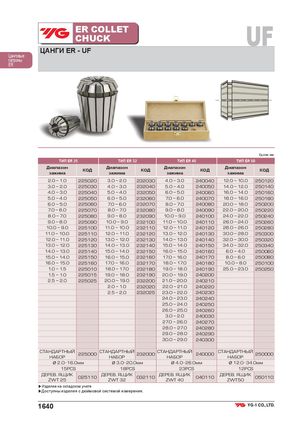 ER COLLETCHUCK UF ЦАНГИ ER - UF Цанговые патроны ER Ед.изм.:мм ТИП ER 25 ТИП ER 32 ТИП ER 40 ТИП ER 50 Диапазонзажима КОД Диапазонзажима КОД Диапазонзажима КОД Диапазонзажима КОД 2.0 ~ 1.0 225020 3.0 ~ 2.0 232030 4.0 ~ 3.0 240040 12.0 ~ 10.0 250120 3.0 ~ 2.0 225030 4.0 ~ 3.0 232040 5.0 ~ 4.0 240050 14.0 ~ 12.0 250140 4.0 ~ 3.0 225040 5.0 ~ 4.0 232050 6.0 ~ 5.0 240060 16.0 ~ 14.0 250160 5.0 ~ 4.0 225050 6.0 ~ 5.0 232060 7.0 ~ 6.0 240070 18.0 ~ 16.0 250180 6.0 ~ 5.0 225060 7.0 ~ 6.0 232070 8.0 ~ 7.0 240080 20.0 ~ 18.0 250200 7.0 ~ 6.0 225070 8.0 ~ 7.0 232080 9.0 ~ 8.0 240090 22.0 ~ 20.0 250220 8.0 ~ 7.0 225080 9.0 ~ 8.0 232090 10.0 ~ 9.0 240100 24.0 ~ 22.0 250240 9.0 ~ 8.0 225090 10.0 ~ 9.0 232100 11.0 ~ 10.0 240110 26.0 ~ 24.0 250260 10.0 ~ 9.0 225100 11.0 ~ 10.0 232110 12.0 ~ 11.0 240120 28.0 ~ 26.0 250280 11.0 ~ 10.0 225110 12.0 ~ 11.0 232120 13.0 ~ 12.0 240130 30.0 ~ 28.0 250300 12.0 ~ 11.0 225120 13.0 ~ 12.0 232130 14.0 ~ 13.0 240140 32.0 ~ 30.0 250320 13.0 ~ 12.0 225130 14.0 ~ 13.0 232140 15.0 ~ 14.0 240150 34.0 ~ 32.0 250340 14.0 ~ 13.0 225140 15.0 ~ 14.0 232150 16.0 ~ 15.0 240160 6.0 ~ 4.0 250060 15.0 ~ 14.0 225150 16.0 ~ 15.0 232160 17.0 ~ 16.0 240170 8.0 ~ 6.0 250080 16.0 ~ 15.0 225160 17.0 ~ 16.0 232170 18.0 ~ 17.0 240180 10.0 ~ 8.0 250100 1.0 ~ 1.5 225010 18.0 ~ 17.0 232180 19.0 ~ 18.0 240190 25.0 ~ 23.0 250250 1.5 ~ 1.0 225015 19.0 ~ 18.0 232190 20.0 ~ 19.0 240200 2.5 ~ 2.0 225025 20.0 ~ 19.0 232200 21.0 ~ 20.0 240210 2.0 ~ 1.0 232020 22.0 ~ 21.0 240220 2.5 ~ 2.0 232025 23.0 ~ 22.0 240230 24.0 ~ 23.0 240240 25.0 ~ 24.0 240250 26.0 ~ 25.0 240260 3.0 ~ 2.0 240030 27.0 ~ 26.0 240270 28.0 ~ 27.0 240280 29.0 ~ 28.0 240290 30.0 ~ 29.0 240300 СТАНДАРТНЫЙНАБОР 225000 СТАНДАРТНЫЙНАБОР 232000 СТАНДАРТНЫЙНАБОР 240000 СТАНДАРТНЫЙНАБОР 250000 Ø 2.0 16.0мм Ø 3.0 20.0мм Ø 4.0 26.0мм Ø 12.0 34.0мм 15PCS 18PCS 23PCS 12PCS ДЕРЕВ. ЯЩИКZWT 25 025110 ДЕРЕВ. ЯЩИКZWT 32032110 ДЕРЕВ. ЯЩИКZWT 40 040110 ДЕРЕВ. ЯЩИКZWT50 050110 ▶Изделие на складском учете ▶Доступны изделия с дюймовой системой измерения. 1640