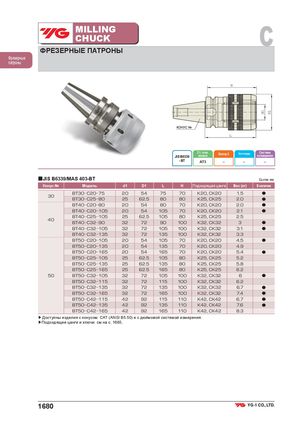 MILLINGCHUCK C ФРЕЗЕРНЫЕ ПАТРОНЫ Фрезерные патроны Ст. точн.JIS B6339конусаБалансир. G Частота вращ. Системаохлаждения - BT AT3 – – – ■JIS B6339/MAS 403-BT Ед.изм.:мм Конус № Модель d1 D1 L H Подходящая цанга Вес (кг) В наличии BT30 C20 75 20 54 75 70 K20, CK20 1.5 ● 30 BT30 C25 80 25 62.5 80 80 K25, CK25 2.0 ● BT40 C20 80 20 54 80 70 K20, CK20 2.0 ● BT40 C20 105 20 54 105 70 K20, CK20 2.1 ● BT40 C25 105 25 62.5 105 80 K25, CK25 2.5 40 BT40 C32 90 32 72 90 100 K32, CK32 3 ● BT40 C32 105 32 72 105 100 K32, CK32 3.1 ● BT40 C32 135 32 72 135 100 K32, CK32 3.3 BT50 C20 105 20 54 105 70 K20, CK20 4.5 ● BT50 C20 135 20 54 135 70 K20, CK20 4.9 BT50 C20 165 20 54 165 70 K20, CK20 5.4 ● BT50 C25 105 25 62.5 105 80 K25, CK25 5.2 BT50 C25 135 25 62.5 135 80 K25, CK25 5.8 BT50 C25 165 25 62.5 165 80 K25, CK25 6.2 50 BT50 C32 105 32 72 105 100 K32, CK32 6 ● BT50 C32 115 32 72 115 100 K32, CK32 6.2 BT50 C32 135 32 72 135 100 K32, CK32 6.7 ● BT50 C32 165 32 72 165 100 K32, CK32 7.4 ● BT50 C42 115 42 92 115 110 K42, CK42 6.7 ● BT50 C42 135 42 92 135 110 K42, CK42 7.6 ● BT50 C42 165 42 92 165 110 K42, CK42 8.3 ▶Доступны изделия с конусом САТ (ANSI B5.50) и с дюймовой системой измерения. ▶Подходящие цанги и ключи см на с. 1685. 1680