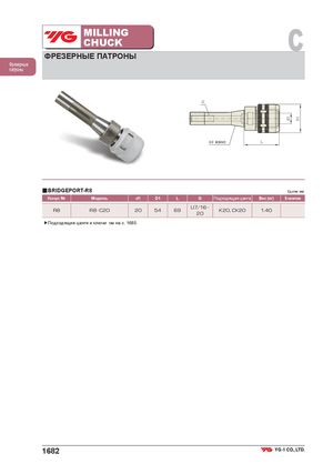 MILLINGCHUCK C ФРЕЗЕРНЫЕ ПАТРОНЫ Фрезерные патроны ■BRIDGEPORT-R8 Ед.изм.:мм Конус № Модель d1 D1 L G Подходящая цанга Вес (кг) В наличии R8 R8 C20 20 54 69 U7/1620 K20, CK20 1.40 ▶Подходящие цанги и ключи см на с. 1685. 1682