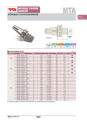 MORSE TAPERARBOR MTA ОПРАВКИ С КОНУСОМ МОРЗЕ Оправки с конусом Морзе Ст. точн.JIS B6339конусаБалансир. G Частота вращ. Системаохлаждения - BT AT3 6.3 15,000 AD ■JIS B6339/MAS 403-BT Ед.изм.:мм Конус № Модель MT No. L d1 D1 Вес (кг) В наличии BT30 MTA1 45 1 45 12.065 25 0.4 ● BT30 MTA2 60 2 60 17.780 32 0.5 ● 30 BT30 MTA2 120 2 120 17.780 32 0.6 BT30 MTA3 75 3 75 23.825 40 0.7 ● BT40 MTA1 45 1 45 12.065 25 1.0 ● BT40 MTA1 120 1 120 12.065 25 1.3 BT40 MTA2 60 2 60 17.780 32 1.0 ● BT40 MTA2 120 2 120 17.780 32 1.4 40 BT40 MTA3 75 3 75 23.825 40 1.2 ● BT40 MTA3 135 3 135 23.825 40 1.8 BT40 MTA4 95 4 95 31.267 50 1.1 ● BT40 MTA4 165 4 165 31.267 50 2.4 BT50 MTA1 45 1 45 12.065 25 4.0 BT50 MTA1 120 1 120 12.065 25 4.3 BT50 MTA1 180 1 180 12.065 25 4.3 BT50 MTA2 45 2 45 17.780 32 4.0 BT50 MTA2 135 2 135 17.780 32 4.4 BT50 MTA2 180 2 180 17.780 32 4.6 BT50 MTA3 45 3 45 23.825 40 3.9 50 BT50 MTA3 150 3 150 23.825 40 4.7 BT50 MTA3 180 3 180 23.825 40 4.9 BT50 MTA4 75 4 75 31.267 50 4.0 BT50 MTA4 105 4 105 31.267 50 4.5 BT50 MTA4 180 4 180 31.267 50 5.4 BT50 MTA5 105 5 105 44.399 65 4.5 BT50 MTA5 210 5 210 44.399 65 7.2 BT50 MTA5 270 5 270 44.399 65 7.5 ▶ Доступны изделия с конусом САТ (ANSI B5.50) и с дюймовой системой измерения. 1687