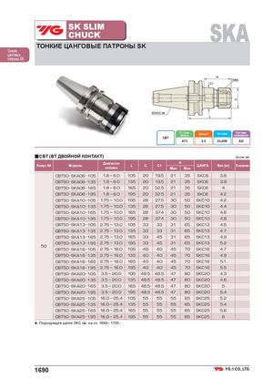 SK SLIMCHUCK SKA ТОНКИЕ ЦАНГОВЫЕ ПАТРОНЫ SK Тонкие цанговые патроны SK Ст. точн.конусаБалансир. G Частота вращ. Системаохлаждения CBT AT3 2.5 25,000 AD ■CBT (BT ДВОЙНОЙ КОНТАКТ) Ед.изм.:мм Конус № Модель Диапазонзажима L HCC1 ЦАНГА Вес (кг) В наличииМинMax CBT50 SKA06 105 1.8 ~ 6.0 105 20 19.5 21 35 SKC6 3.8 CBT50 SKA06 135 1.8 ~ 6.0 135 20 19.5 21 35 SKC6 3.9 CBT50 SKA06 165 1.8 ~ 6.0 165 20 32.5 21 35 SKC6 4 CBT50 SKA06 195 1.8 ~ 6.0 195 20 32.5 21 35 SKC6 4.2 CBT50 SKA10 105 1.75 ~ 10.0 105 28 27.5 30 50 SKC10 4.2 CBT50 SKA10 135 1.75 ~ 10.0 135 28 27.5 30 50 SKC10 4.4 CBT50 SKA10 165 1.75 ~ 10.0 165 28 37.4 30 50 SKC10 4.6 CBT50 SKA10 195 1.75 ~ 10.0 195 28 37.4 30 50 SKC10 4.8 CBT50 SKA13 105 2.75 ~ 13.0 105 33 33 31 65 SKC13 4.5 CBT50 SKA13 135 2.75 ~ 13.0 135 33 33 31 65 SKC13 4.7 CBT50 SKA13 165 2.75 ~ 13.0 165 33 45 31 65 SKC13 4.9 CBT50 SKA13 195 2.75 ~ 13.0 195 33 45 31 65 SKC13 5.2 50 CBT50 SKA16 105 2.75 ~ 16.0 105 40 40 45 70 SKC16 4.7 CBT50 SKA16 135 2.75 ~ 16.0 135 40 40 45 70 SKC16 4.9 CBT50 SKA16 165 2.75 ~ 16.0 165 40 40 45 70 SKC16 5.1 CBT50 SKA16 195 2.75 ~ 16.0 195 40 40 45 70 SKC16 5.5 CBT50 SKA20 105 3.5 ~ 20.0 105 48.5 48.5 47 80 SKC20 4.3 CBT50 SKA20 135 3.5 ~ 20.0 135 48.5 48.5 47 80 SKC20 4.6 CBT50 SKA20 165 3.5 ~ 20.0 165 48.5 48.5 47 80 SKC20 5 CBT50 SKA20 195 3.5 ~ 20.0 195 48.5 48.5 47 80 SKC20 5.4 CBT50 SKA25 105 16.0 ~ 25.4 105 55 55 55 85 SKC25 5.2 CBT50 SKA25 135 16.0 ~ 25.4 135 55 55 55 85 SKC25 5.4 CBT50 SKA25 165 16.0 ~ 25.4 165 55 55 55 85 SKC25 5.6 CBT50 SKA25 195 16.0 ~ 25.4 195 55 55 55 85 SKC25 6 ▶ Подходящие цанги SKC см. на сс. 1699~ 1700. 1690