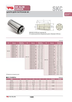 SK SLIMCHUCK SKC ЦАНГИ ДЛЯ ПАТРОНОВ SK Тонкие цанговые патроны SK БИЕНИЕ:≤0.005 мм на вылете 3D (По запросу доступна специальная цанга с биением 0.003 мм ). Ед.изм.:мм ТИП Модель Диапазонзажима (d)ТИП Модель Диапазонзажима (d)ТИП Модель Диапазонзажима (d) SKC6 2 1.8 ~ 2.0 SKC10 2 1.75 ~ 2.0 SKC13 3 2.75 ~ 3.0 SKC6 2.5 2.3 ~ 2.5 SKC10 2.5 2.25 ~ 2.5 SKC13 3.5 3.0 ~ 3.5 SKC6 3 2.8 ~ 3.0 SKC10 3 2.75 ~ 3.0 SKC13 4 3.5 ~ 4.0 SKC6 3.5 3.0 ~ 3.5 SKC10 3.5 3.0 ~ 3.5 SKC13 4.5 4.0 ~ 4.5 SKC6 SKC6 4 3.5 ~ 4.0 SKC10 4 3.5 ~ 4.0 SKC13 5 4.5 ~ 5.0 SKC6 4.5 4.0 ~ 4.5 SKC10 4.5 4.0 ~ 4.5 SKC13 5.5 5.0 ~ 5.5 SKC6 5 4.5 ~ 5.0 SKC10 5 4.5 ~ 5.0 SKC13 6 5.5 ~ 6.0 SKC6 5.5 5.0 ~ 5.5 SKC10 5.5 5.0 ~ 5.5 SKC13 6.5 6.0 ~ 6.5 SKC6 6 5.5 ~ 6.0 SKC10 SKC10 6 5.5 ~ 6.0 SKC13 7 6.5 ~ 7.0 SKC10 6.5 6.0 ~ 6.5 SKC13 7.5 7.0 ~ 7.5 SKC10 7 6.5 ~ 7.0 SKC13 SKC13 8 7.5 ~ 8.0 SKC10 7.5 7.0 ~ 7.5 SKC13 8.5 8.0 ~ 8.5 SKC10 8 7.5 ~ 8.0 SKC13 9 8.5 ~ 9.0 SKC10 8.5 8.0 ~ 8.5 SKC13 9.5 9.0 ~ 9.5 SKC10 9 8.5 ~ 9.0 SKC13 10 9.5 ~ 10.0 SKC10 9.5 9.0 ~ 9.5 SKC13 10.5 10.0 ~ 10.5 SKC10 10 9.5 ~ 10.0 SKC13 11 10.5 ~ 11.0 SKC13 11.5 11.0 ~ 11.5 SKC13 12 11.5 ~ 12.0 SKC13 12.5 12.0 ~ 12.5 ▶Изделие на складском учете SKC13 13 12.5 ~ 13.0 ■SKC РАЗМЕРЫ Ед.изм.:мм ТИП D L L1 H C Вес (кг) В наличии SKC6 7.5 25.7 17.6 3.8 10 0.03 SKC10 12 32 21.3 5 15 0.04 SKC13 15.4 39 28.3 5.5 20 SKC16 18.8 46 32 8 24 0.06 SKC20 22.5 54.2 41 8 29 SKC25 28.9 58.2 43 8.5 35 0.10 1699