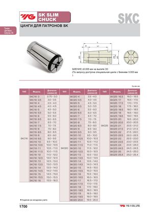 SK SLIMCHUCK SKC ЦАНГИ ДЛЯ ПАТРОНОВ SK Тонкие цанговые патроны SK БИЕНИЕ:≤0.005 мм на вылете 3D (По запросу доступна специальная цанга с биением 0.003 мм ). Ед.изм.:мм ТИП Модель Диапазонзажима (d)ТИП Модель Диапазонзажима (d)ТИП Модель Диапазонзажима (d) SKC16 3 2.75 ~ 3.0 SKC20 4 3.5 ~ 4.0 SKC25 16.5 16.0 ~ 16.5 SKC16 3.5 3.0 ~ 3.5 SKC20 4.5 4.0 ~ 4.5 SKC25 17 16.5 ~ 17.0 SKC16 4 3.5 ~ 4.0 SKC20 5 4.5 ~ 5.0 SKC25 17.5 17.0 ~ 17.5 SKC16 4.5 4.0 ~ 4.5 SKC20 5.5 5.0 ~ 5.5 SKC25 18 17.5 ~ 18.0 SKC16 5 4.5 ~ 5.0 SKC20 6 5.5 ~ 6.0 SKC25 18.5 18.0 ~ 18.5 SKC16 5.5 5.0 ~ 5.5 SKC20 6.5 6.0 ~ 6.5 SKC25 19 18.5 ~ 19.0 SKC16 6 5.5 ~ 6.0 SKC20 7 6.5 ~ 7.0 SKC25 19.5 19.0 ~ 19.5 SKC16 6.5 6.0 ~ 6.5 SKC20 7.5 7.0 ~ 7.5 SKC25 20 19.5 ~ 20.0 SKC16 7 6.5 ~ 7.0 SKC20 8 7.5 ~ 8.0 SKC25 20.5 20.0 ~ 20.5 SKC16 7.5 7.0 ~ 7.5 SKC20 8.5 8.0 ~ 8.5 SKC25 SKC25 21 20.5 ~ 21.0 SKC16 8 7.5 ~ 8.0 SKC20 9 8.5 ~ 9.0 SKC25 21.5 21.0 ~ 21.5 SKC16 8.5 8.0 ~ 8.5 SKC20 9.5 9.0 ~ 9.5 SKC25 22 21.5 ~ 22.0 SKC16 9 8.5 ~ 9.0 SKC20 10 9.5 ~ 10.0 SKC25 22.5 22.0 ~ 22.5 SKC16 SKC16 9.5 9.0 ~ 9.5 SKC20 10.5 10.0 ~ 10.5 SKC25 23 22.5 ~ 23.0 SKC16 10 9.5 ~ 10.0 SKC20 11 10.5 ~ 11.0 SKC25 23.5 23.0 ~ 23.5 SKC16 10.5 10.0 ~ 10.5 SKC20 11.5 11.0 ~ 11.5 SKC25 24 23.5 ~ 24.0 SKC16 11 10.5 ~ 11.0 SKC20 SKC20 12 11.5 ~ 12.0 SKC25 24.5 24.0 ~ 24.5 SKC16 11.5 10.0 ~ 11.5 SKC20 12.5 12.0 ~ 12.5 SKC25 25 24.5 ~ 25.0 SKC16 12 11.5 ~ 12.0 SKC20 13 12.5 ~ 13.0 SKC25 25.4 25.0 ~ 25.4 SKC16 12.5 12.0 ~ 12.5 SKC20 13.5 13.0 ~ 13.5 SKC16 13 12.5 ~ 13.0 SKC20 14 13.5 ~ 14.0 SKC16 13.5 13.0 ~ 13.5 SKC20 14.5 14.0 ~ 14.5 SKC16 14 13.5 ~ 14.0 SKC20 15 14.5 ~ 15.0 SKC16 14.5 14.0 ~ 14.5 SKC20 15.5 15.0 ~ 15.5 SKC16 15 14.5 ~ 15.0 SKC20 16 15.5 ~ 16.0 SKC16 15.5 15.0 ~ 15.5 SKC20 16.5 16.0 ~ 16.5 SKC16 16 15.5 ~ 16.0 SKC20 17 16.5 ~ 17.0 SKC20 17.5 17.0 ~ 17.5 SKC20 18 17.5 ~ 18.0 SKC20 18.5 18.0 ~ 18.5 SKC20 19 18.5 ~ 19.0 SKC20 19.5 19.0 ~ 19.5 ▶Изделие на складском учете SKC20 20.0 19.5 ~ 20.0 1700