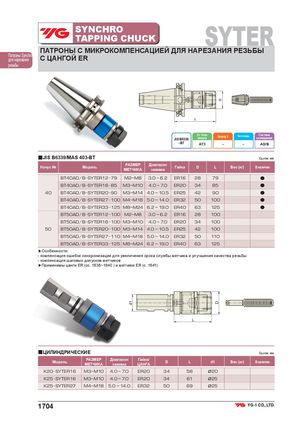 SYNCHROTAPPING CHUCK SYTER ПАТРОНЫ С МИКРОКОМПЕНСАЦИЕЙ ДЛЯ НАРЕЗАНИЯ РЕЗЬБЫ Патроны Synchroдля нарезанияС ЦАНГОЙ ER резьбы Ст. точн.JIS B6339конусаБалансир. G Частота вращ. Системаохлаждения - BT AT3 – – AD/B ■JIS B6339/MAS 403-BT Ед.изм.:мм Конус № Модель РАЗМЕР ДиапазонМЕТЧИКАзажимаГайка D L Вес (кг) В наличии BT40AD/B SYTER12 79 M2~M8 3.0 ~ 6.2 ER16 28 79 ● BT40AD/B SYTER16 85 M3~M10 4.0 ~ 7.0 ER20 34 85 ● 40 BT40AD/B SYTER20 90 M3~M14 4.0 ~ 10.5 ER25 42 90 ● BT40AD/B SYTER27 100 M4~M18 5.0 ~ 14.0 ER32 50 100 ● BT40AD/B SYTER33 125 M8~M24 6.2 ~ 19.0 ER40 63 125 ● BT50AD/B SYTER12 100 M2~M8 3.0 ~ 6.2 ER16 28 100 BT50AD/B SYTER16 100 M3~M10 4.0 ~ 7.0 ER20 34 100 50 BT50AD/B SYTER20 100 M3~M14 4.0 ~ 10.5 ER25 42 100 BT50AD/B SYTER27 110 M4~M18 5.0 ~ 14.0 ER32 50 110 BT50AD/B SYTER33 125 M8~M24 6.2 ~ 19.0 ER40 63 125 ▶Особенности: - компенсация ошибок синхронизации для увеличения срока службы метчика и улучшения качества резьбы - компенсация шаговых допусков метчиков ▶Применимы цанги ER (сс. 1638~1640 ) и метчики ER (с. 1641) L ■ЦИЛИНДРИЧЕСКИЕ Ед.изм.:мм Модель РАЗМЕР Диапазон Гайка/МЕТЧИКАзажимаЦАНГАD L d1 Вес (кг) В наличии K20 SYTER16 M3~M10 4.0 ~ 7.0 ER20 34 58 Ø20 K25 SYTER16 M3~M10 4.0 ~ 7.0 ER20 34 61 Ø25 K25 SYTER27 M4~M18 5.0 ~ 14.0 ER32 50 69 Ø25 1704 d1 D